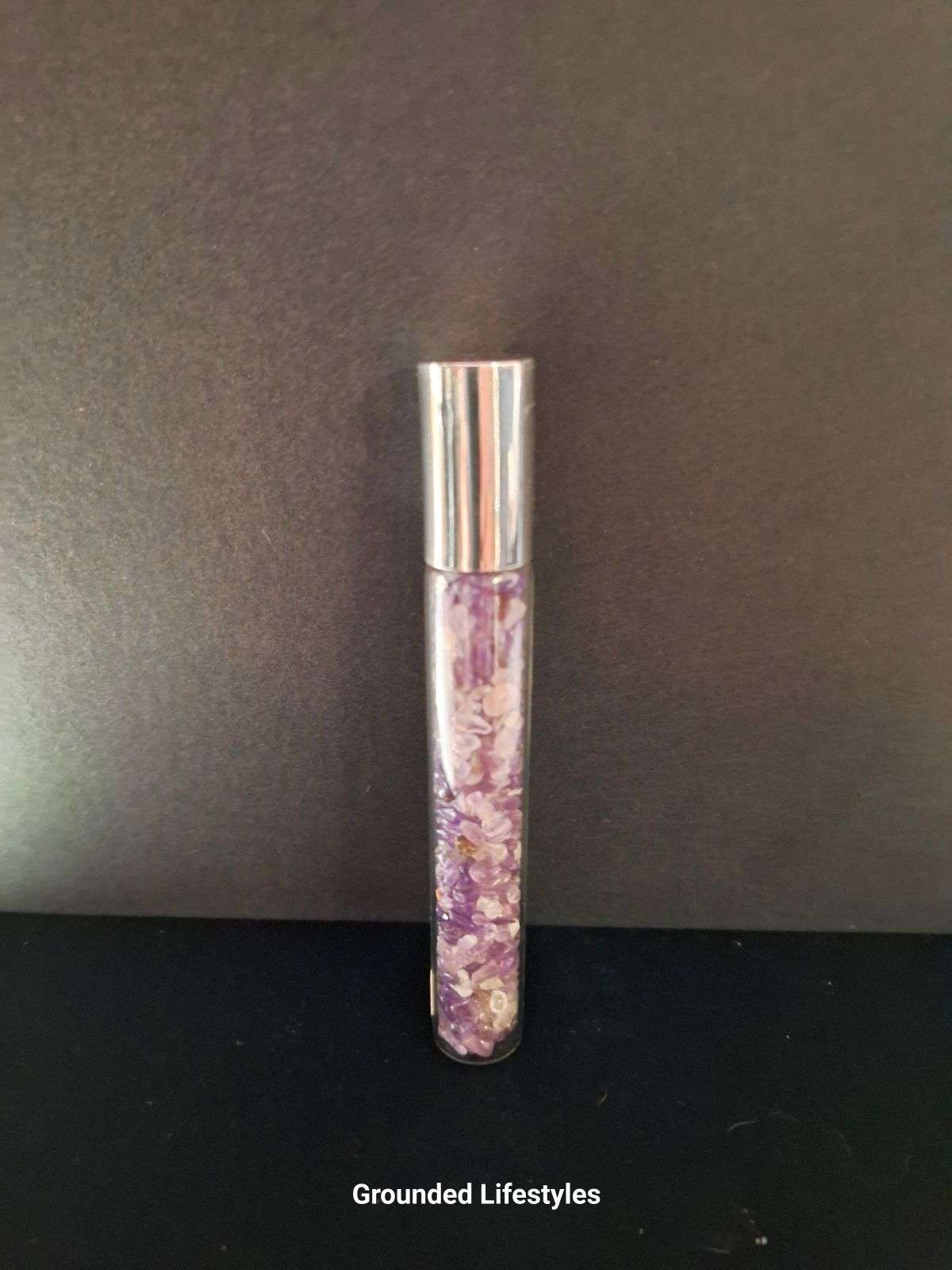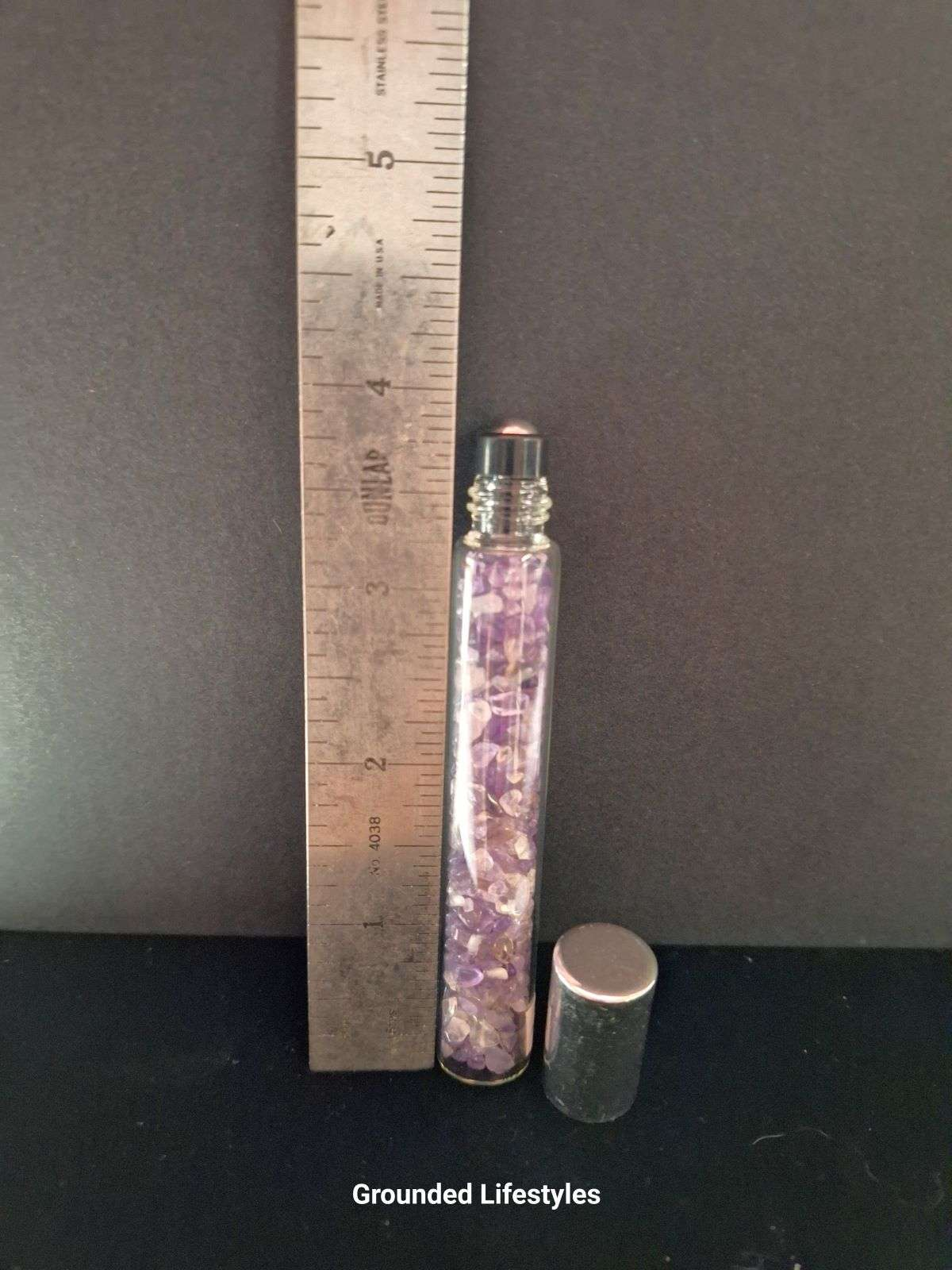 This 4.25-inch amethyst essential oil roller unites crystal beauty with practical design. The clear glass bottle is pre-filled with polished amethyst chips, allowing the gentle violet tones to shimmer through the liquid. A removable silver-and-black roller head ensures smooth, even application and easy cleaning between blends. The silver cap seals the bottle securely, maintaining both fragrance and clarity.