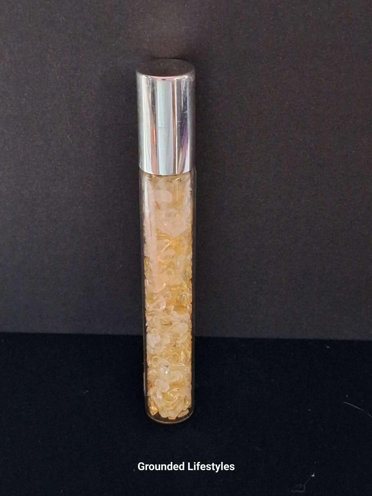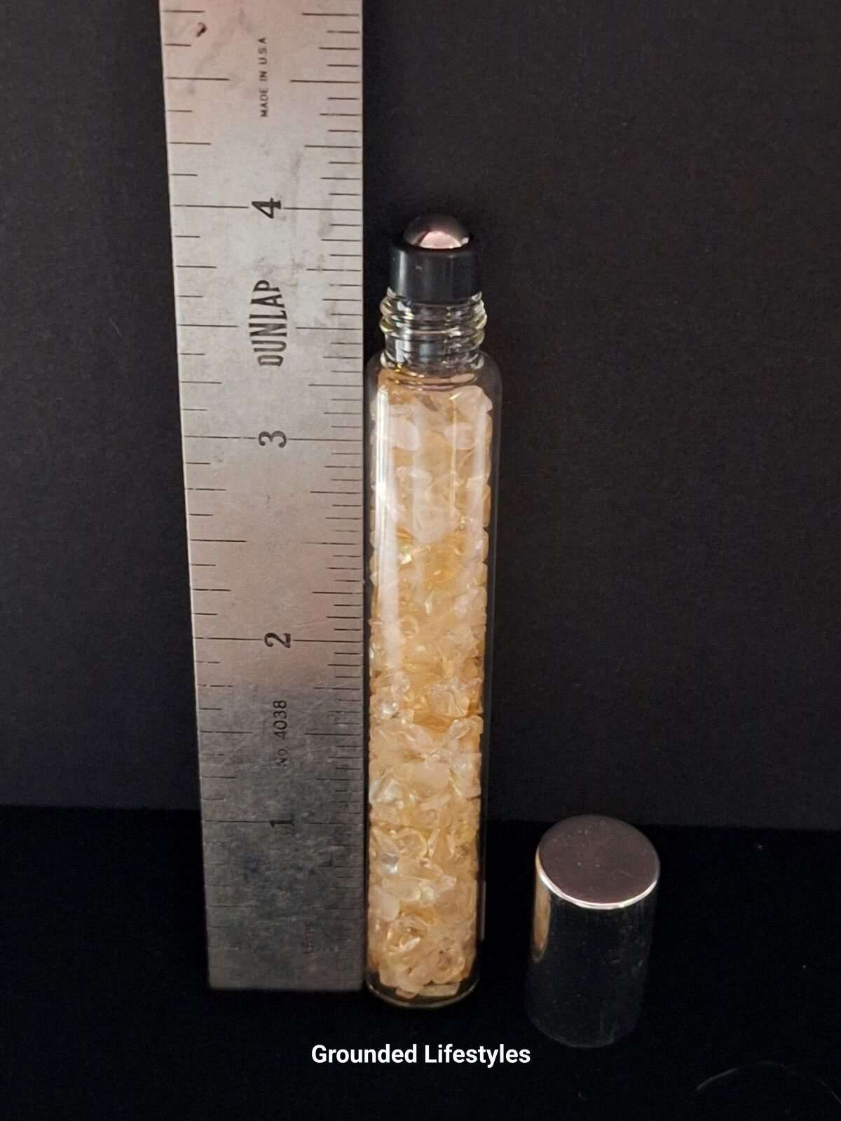 This 4.25-inch citrine essential oil roller radiates warmth and clarity. Each refillable glass bottle is pre-filled with sunlit citrine gemstone chips, polished to reveal golden transparency and subtle inclusions. The removable silver-and-black roller head ensures smooth application, while the silver cap completes the refined design, preserving both scent and gemstone vitality. Perfect for oils, perfumes, or personal wellness blends.