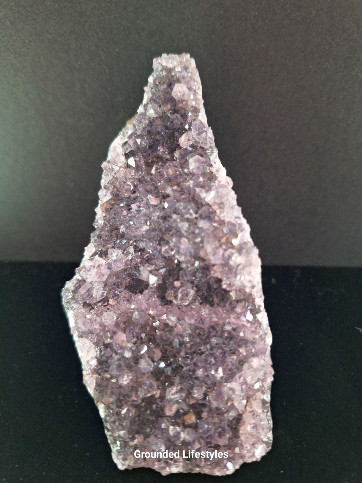 This 3-inch amethyst cut base is crafted from a Brazilian geode formation, where the underside is polished flat for stability while the crystal face remains in its natural state. The quartz points display layered purple tones—ranging from pale lavender tips to deeper violet near the base—offering strong visual contrast against the dark basalt host rock.