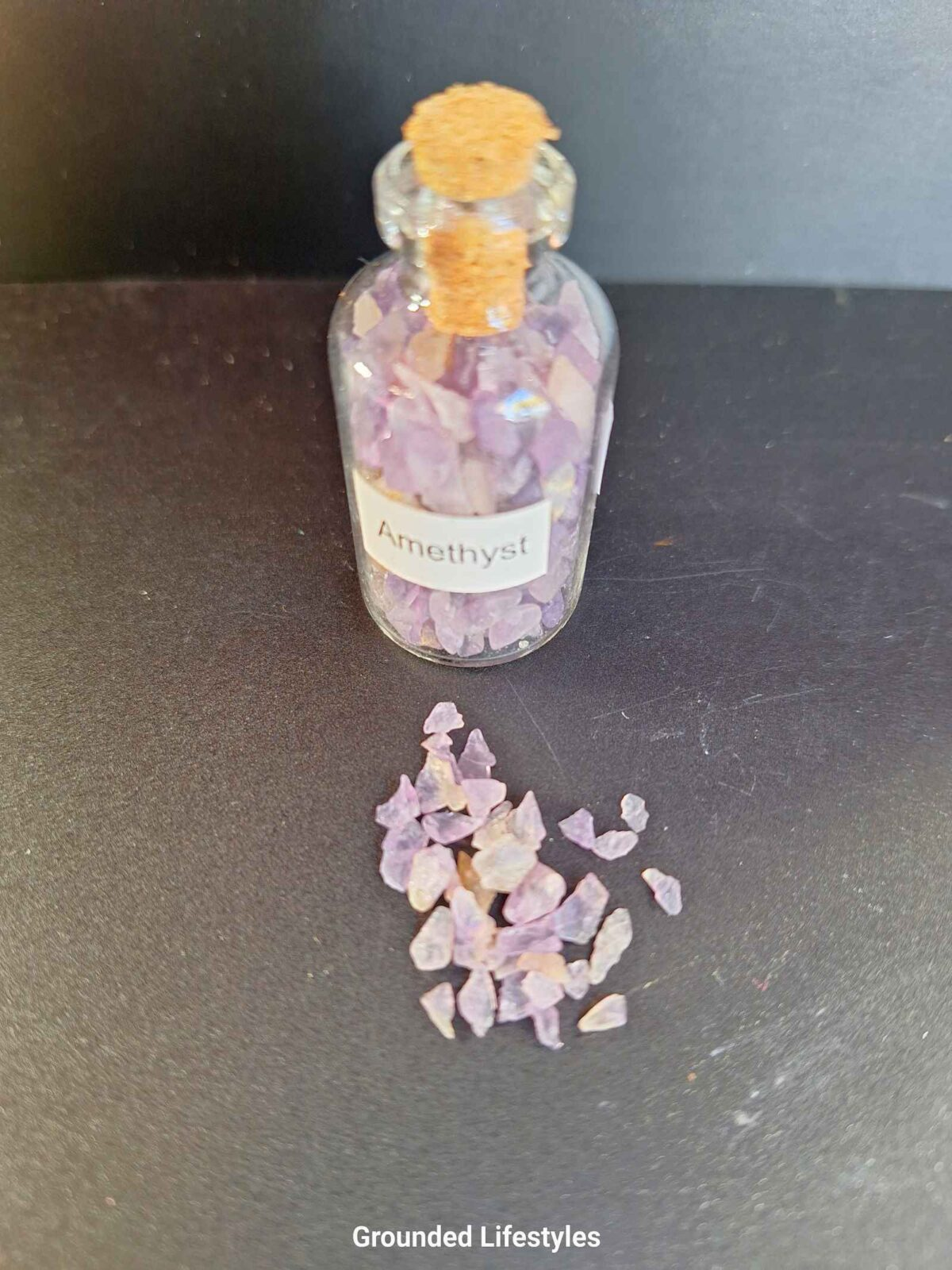 This 8 oz clear glass bottle is packed with polished amethyst gemstone grains—small fragments of natural quartz prized for their vibrant purple hues. Each piece is carefully selected to reflect amethyst’s crystal clarity and rich coloration, making the bottle as visually stunning as it is tactile.