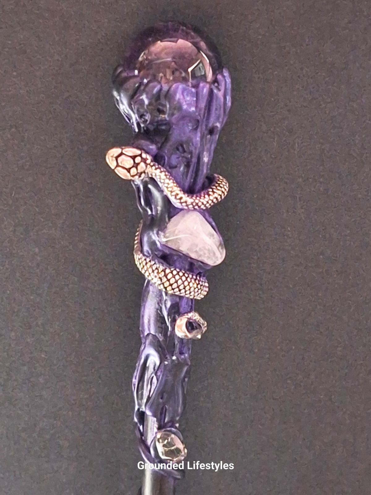 This wand harmonizes deep lavender amethyst hues with the metallic sheen of the purple serpent, coiled elegantly around the resin handle. The contrast between the gemstone’s crystalline clarity and the serpent’s sculptural detail gives this piece powerful visual balance. Measuring 10.5 inches, it feels substantial yet comfortable, suitable for both practical and ornamental use.