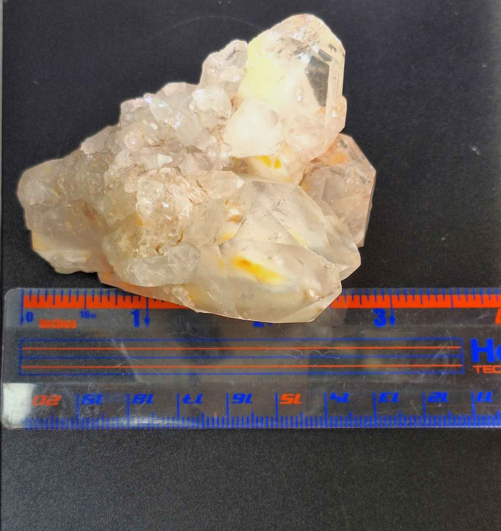 Structure & Luster: Quartz crystal cluster with embedded amphibole needles and tabular crystal faces