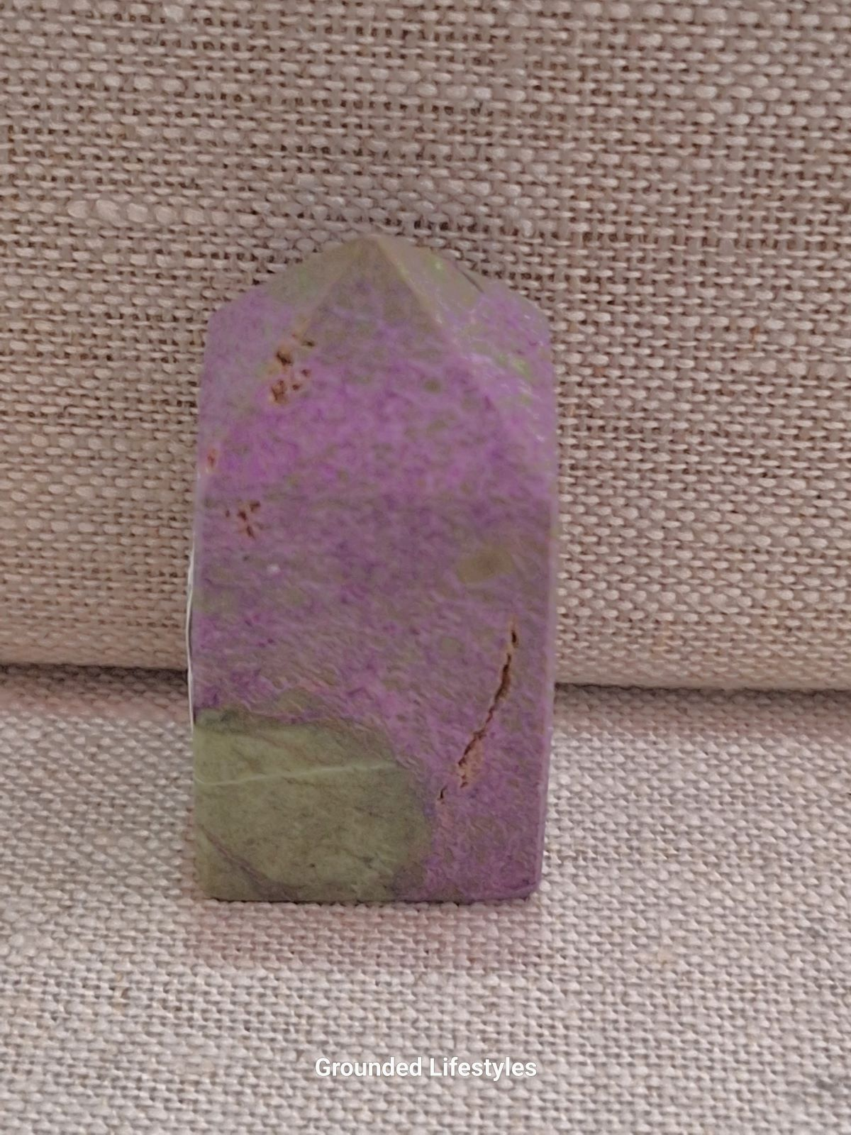 This 2-inch atlantasite point is carved from a striking combination of lime-to-olive green serpentine and purple stichtite. Artisans shape the stone into a compact, upright point, polishing the facets to reveal the swirling interplay between soft serpentine textures and the vibrant, fine-grained stichtite pockets.