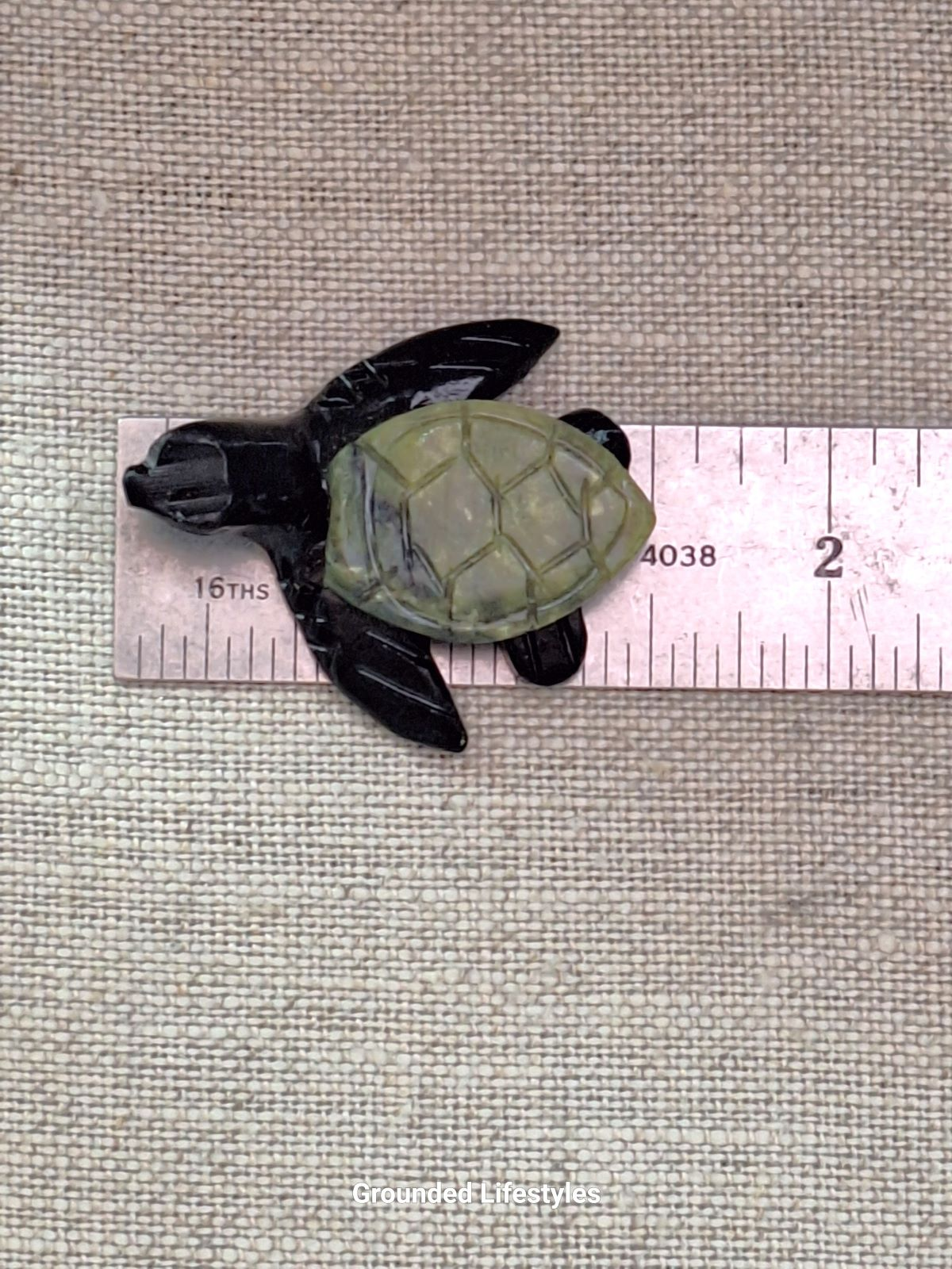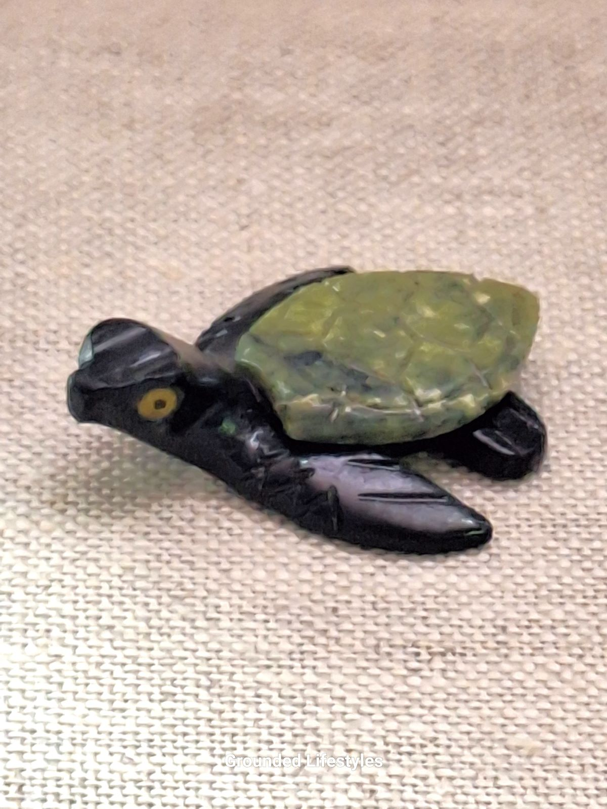 At 1.5 inches, this turtle offers strong visual contrast: a sleek black onyx head and legs set against a warm green serpentine shell. The polish enhances reflective surfaces, while natural variations in the serpentine create unique patterning in each piece.