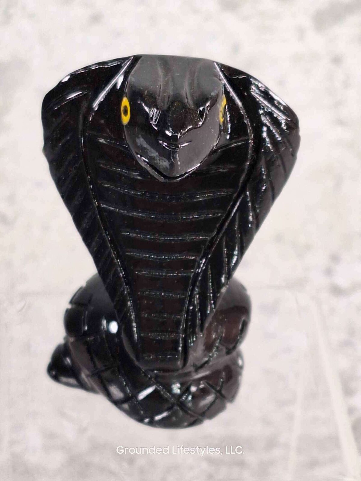 This cobra is carved from black onyx, a type of chalcedony formed in mineral-rich environments. Its deep black color and cryptocrystalline structure make it durable for detailed carving and polishing. Mohs hardness is 6.5–7, providing both strength and longevity.