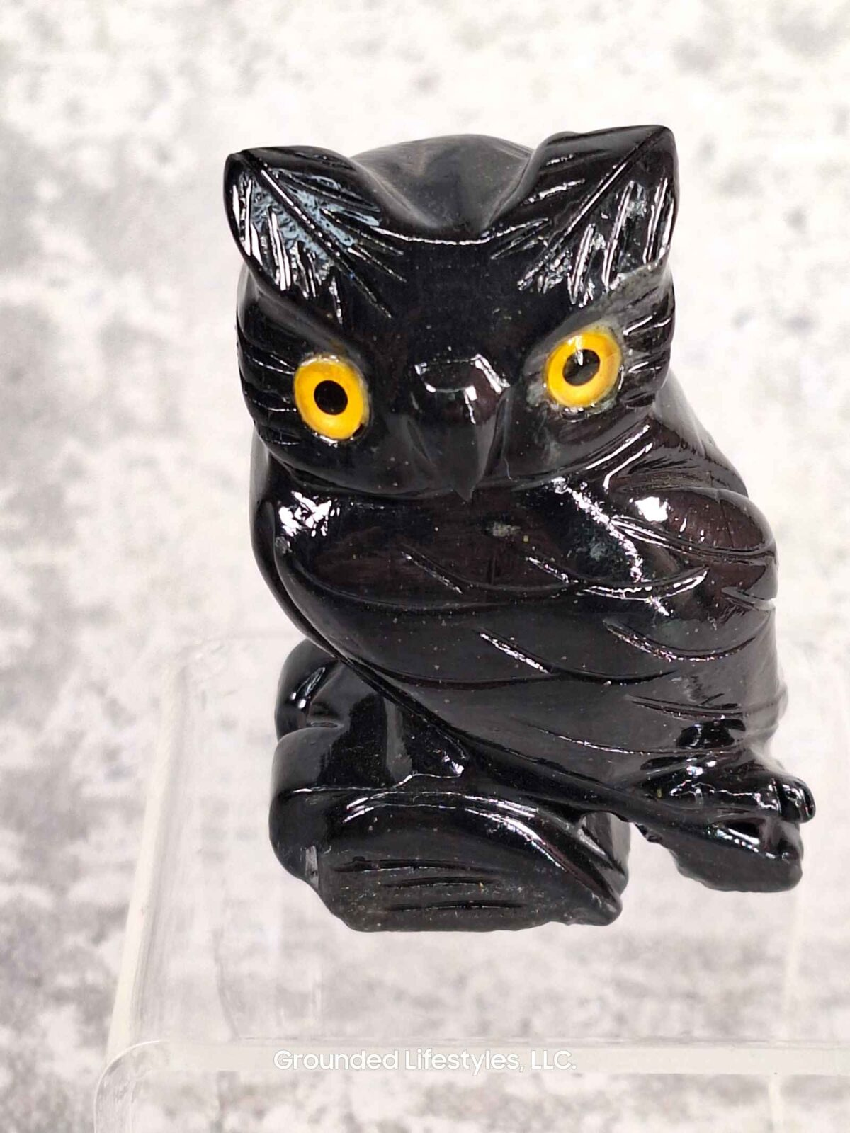 Carved from black onyx, a variety of chalcedony (microcrystalline quartz), this owl showcases a deep, timeless black hue. Onyx rates 6.5 to 7 on the Mohs hardness scale, making it durable for detailed carving and long-lasting display.