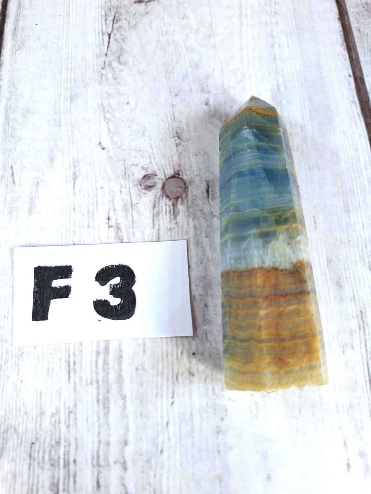 Appearance: Alternating bands of deep to pale blue and white, polished termination.