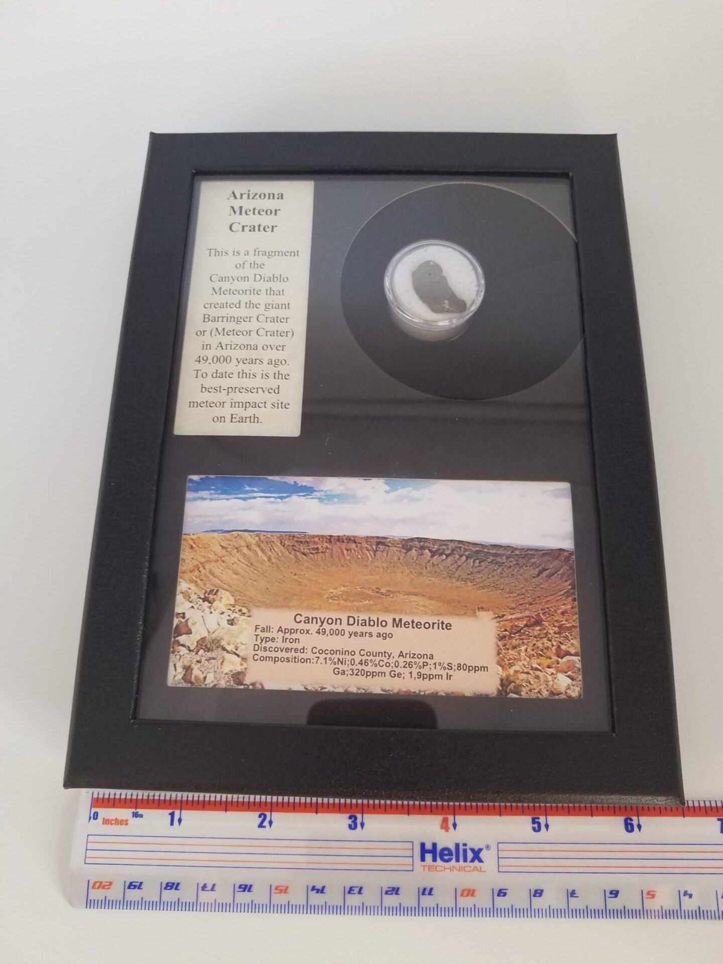 Handsome Display featuring a specimen of Canyon Diablo Meteorite. Case measures 6 inches long by 8 inches high and .75 inches wide. The front of the display is glass.