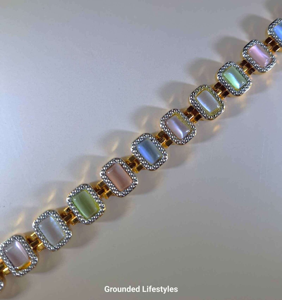 The bracelet showcases a sophisticated cats-eye pattern interspersed with cubic zirconia accents. Its sleek, polished links catch the light gracefully, offering a luxurious look without being over the top. Ideal for adding a touch of elegance to any outfit.