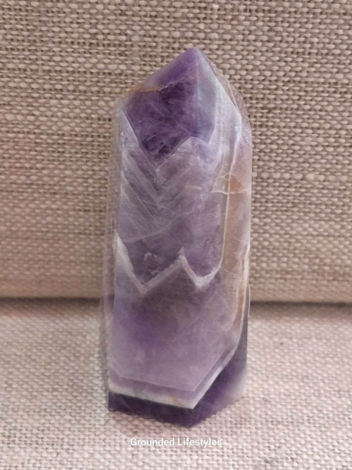 At 2.50 inches, this point is small enough for compact spaces yet large enough to reveal the full chevron pattern. The purple bands are well defined, and the polished facets provide clear views of internal zoning, making each piece distinctive and visually expressive.