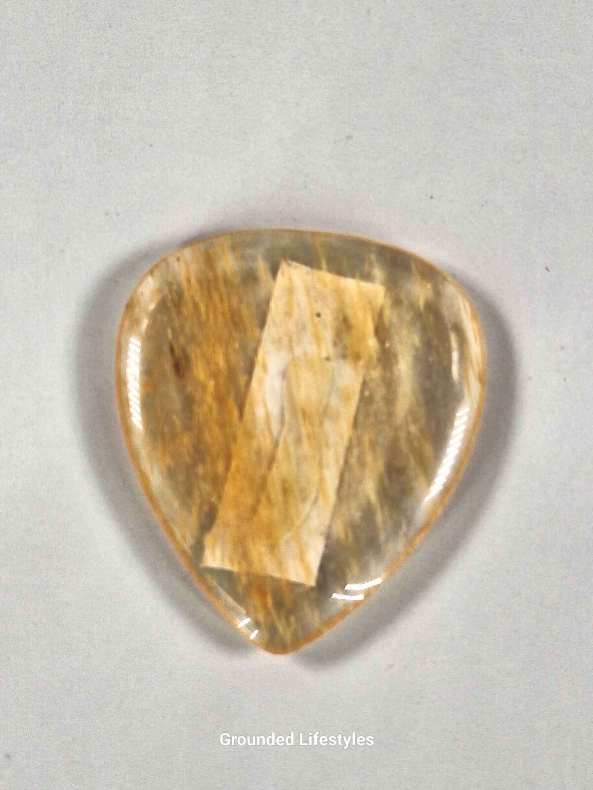 The Citrine Guitar Pick is a handcrafted plectrum made from unique mineral material, offering musicians a distinctive playing experience. Its natural composition provides a rich tonal quality and visual appeal, making it a valuable addition to any musician’s collection.