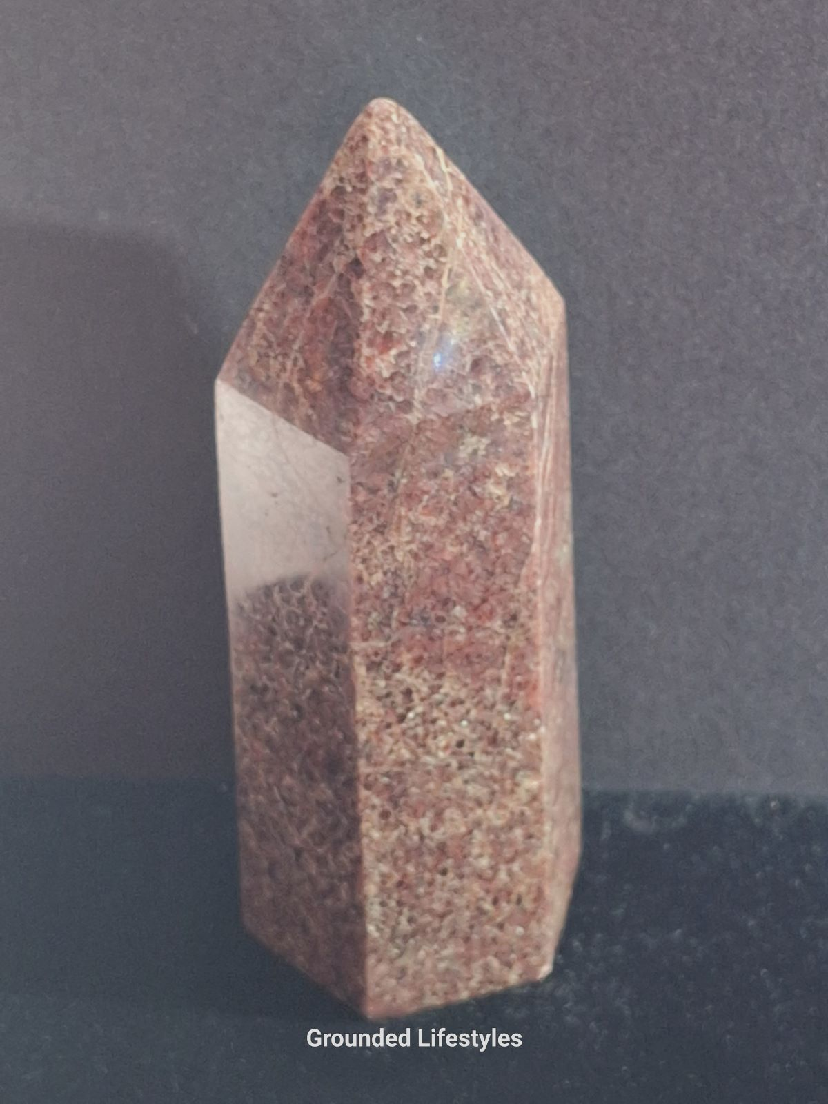At 5 inches tall, this Garnet Point shows a highly polished finish that enhances its internal glow. The fine-grained matrix holds scattered garnet crystals, giving the piece a visual texture of natural inclusions within a unified tower form. It’s an excellent collector-grade display piece or decorative energy accent for interior styling.