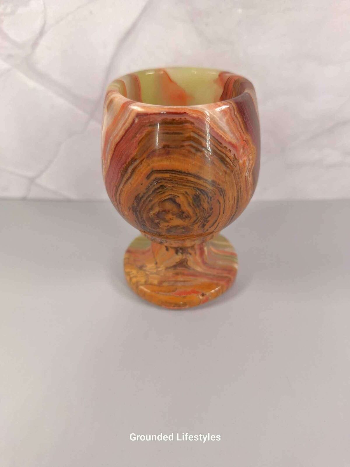 Each glass is thoughtfully hand-carved from a single piece of this material, preserving natural color transitions and banding. The polish lends a refined shine that highlights the patterns beautifully. These glasses are elegant for sipping sherry or wine, and also make striking decorative objects or thoughtful gifts.
