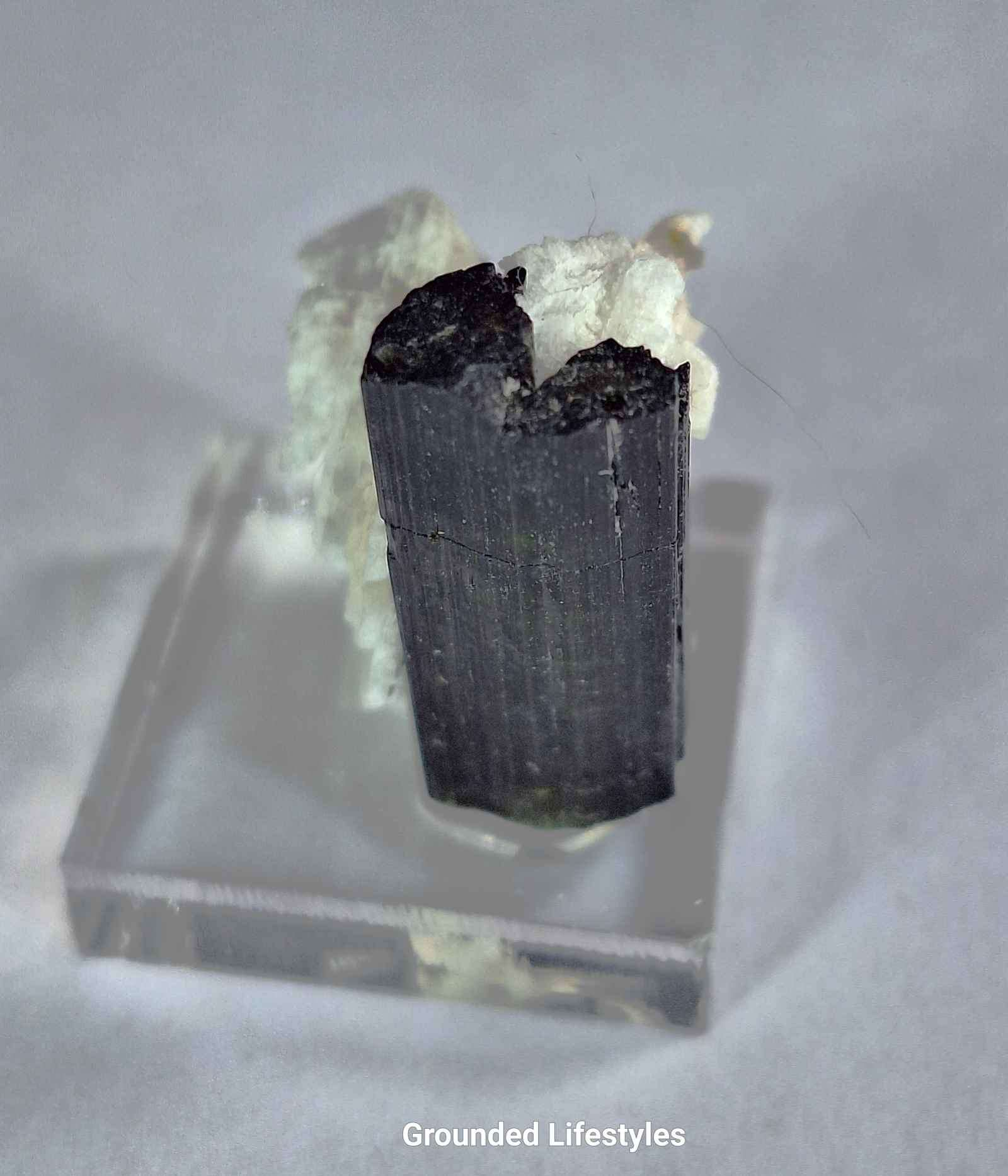 Tourmaline has a Mohs hardness of about 7–7.5, while albite is slightly softer at 6–6.5. To preserve its high-quality condition, handle with care—keep it dust-free, clean gently with a soft brush or blower, and avoid exposure to harsh chemicals or prolonged moisture.