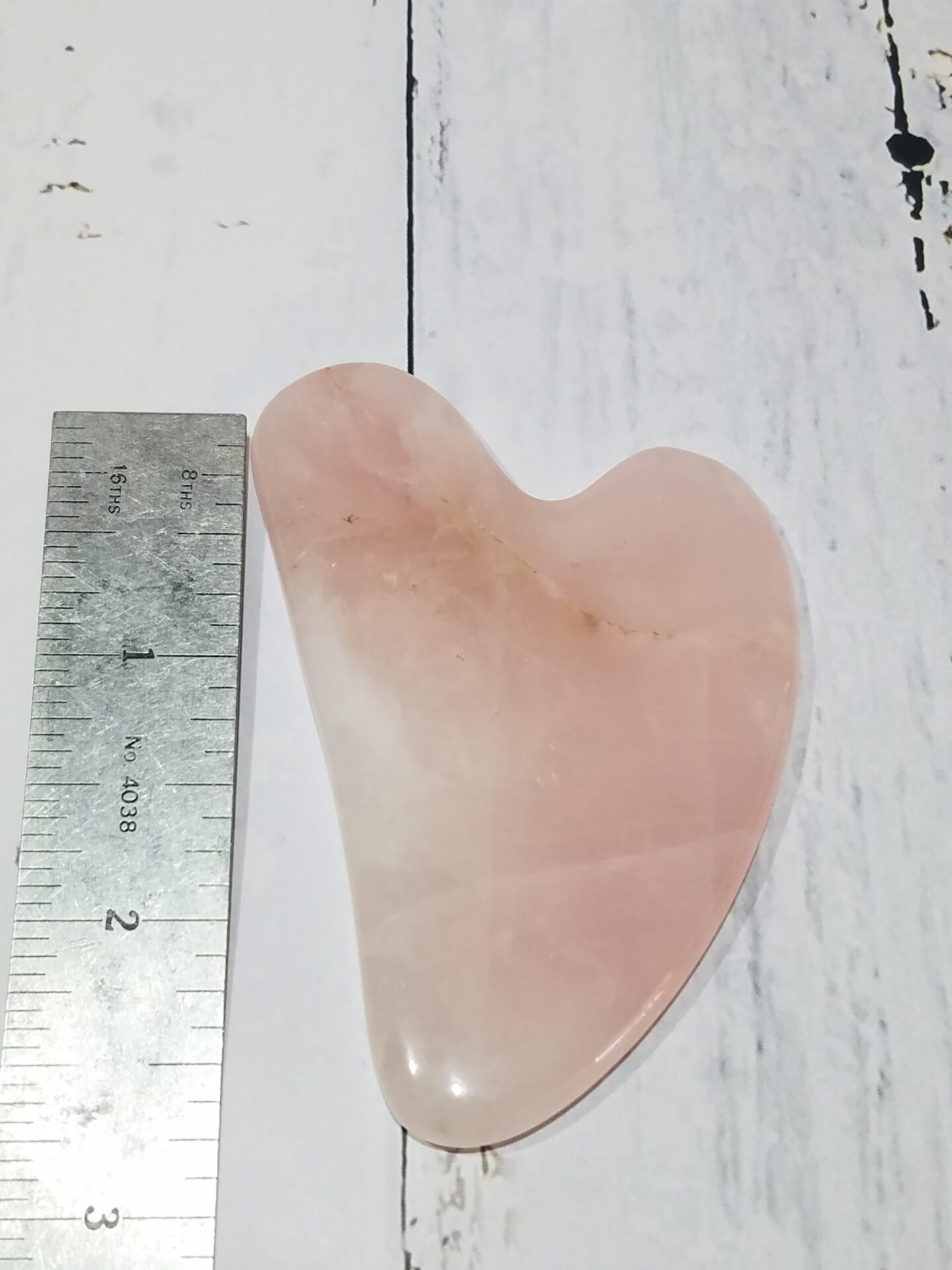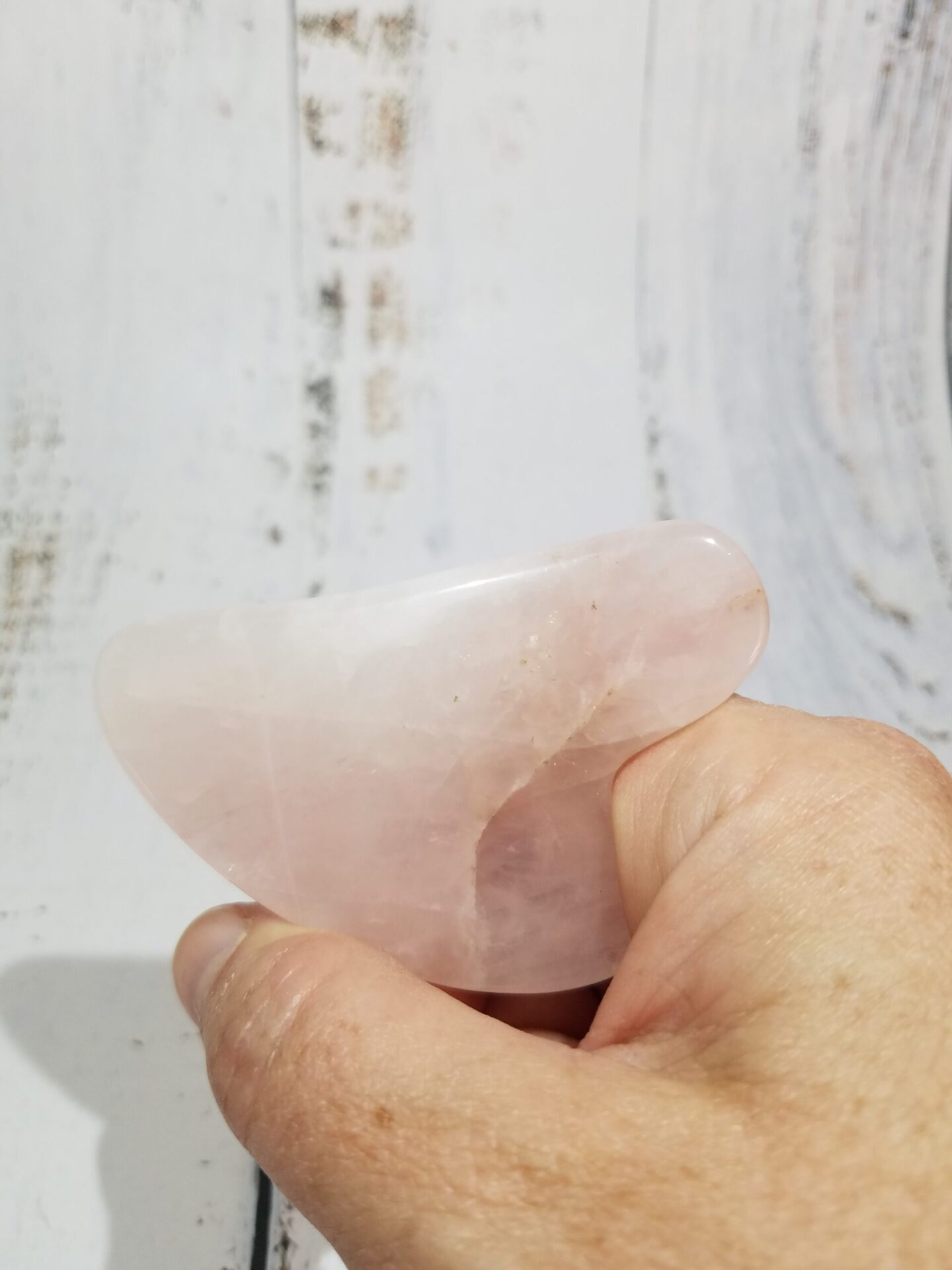 This Gua Sha tool is expertly carved from authentic rose quartz, polished to a smooth finish for comfortable use. Its ergonomic shape fits naturally in the hand, allowing precise control during facial massage or contouring routines.