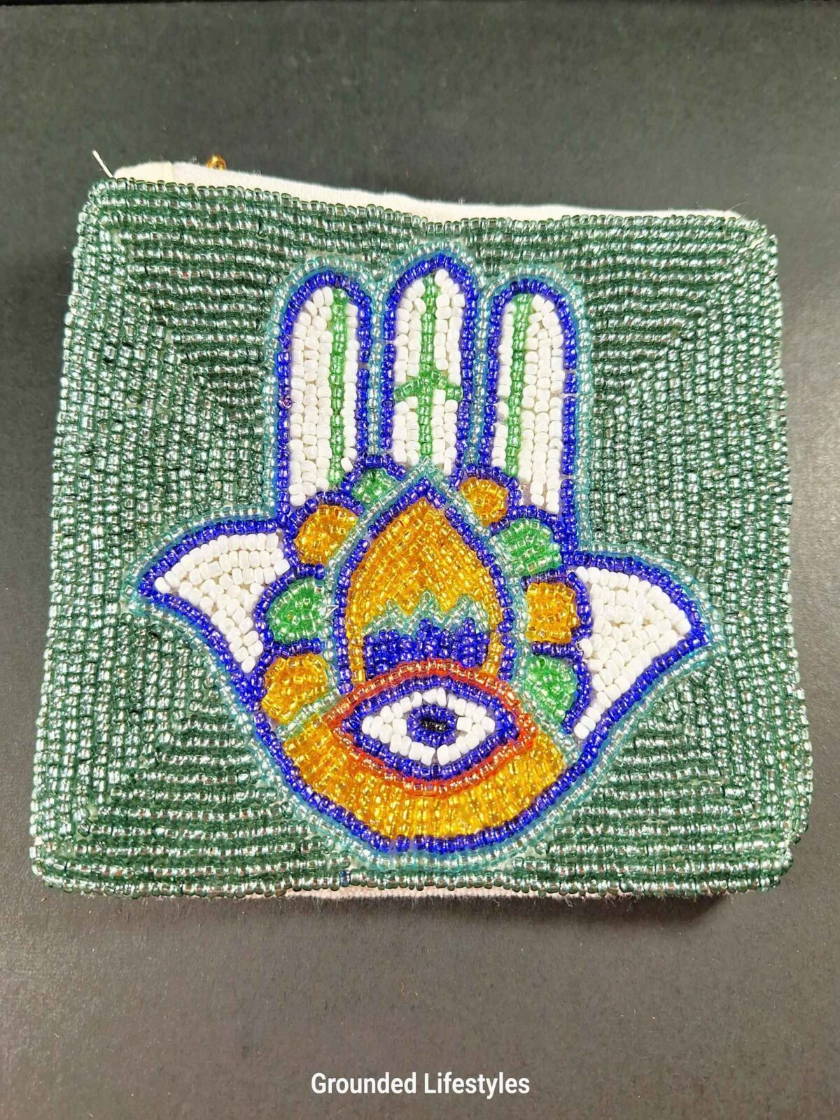 This Hamsa Beaded Zip Pouch is a true testament to artisanal skill and cultural heritage. Each pouch is meticulously hand-beaded—rendering the intricate Hamsa hand, an ancient talisman of protection—onto a durable fabric base with a secure zipper closure for practicality and style.