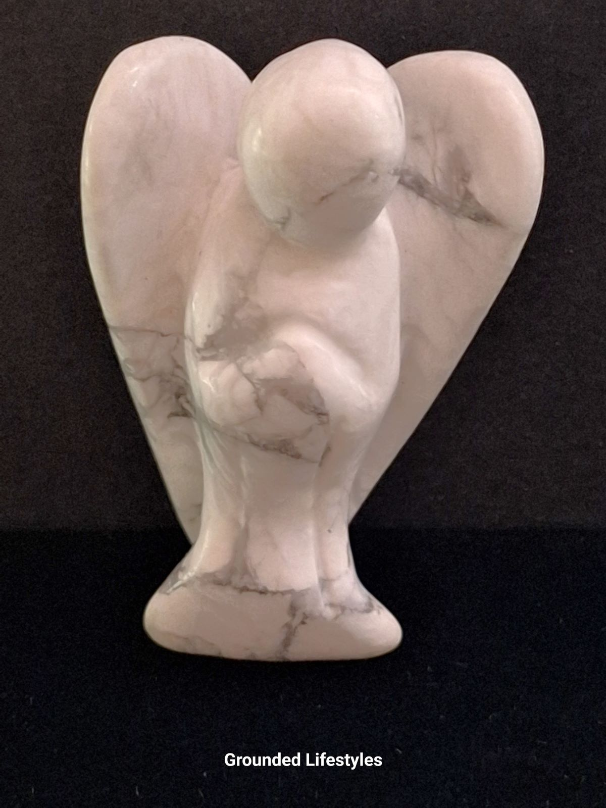 Collectors often use howlite angels as gentle reminders of mindfulness and as decorative symbols of hope, serenity, or remembrance.
