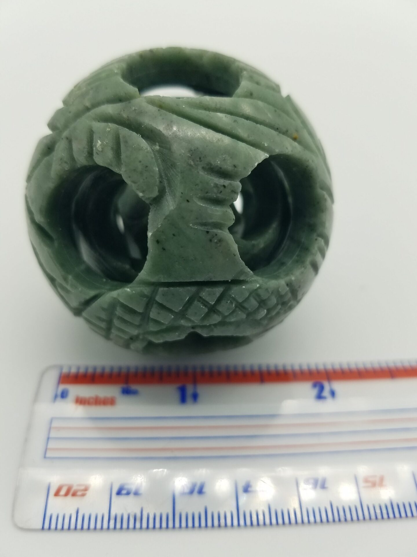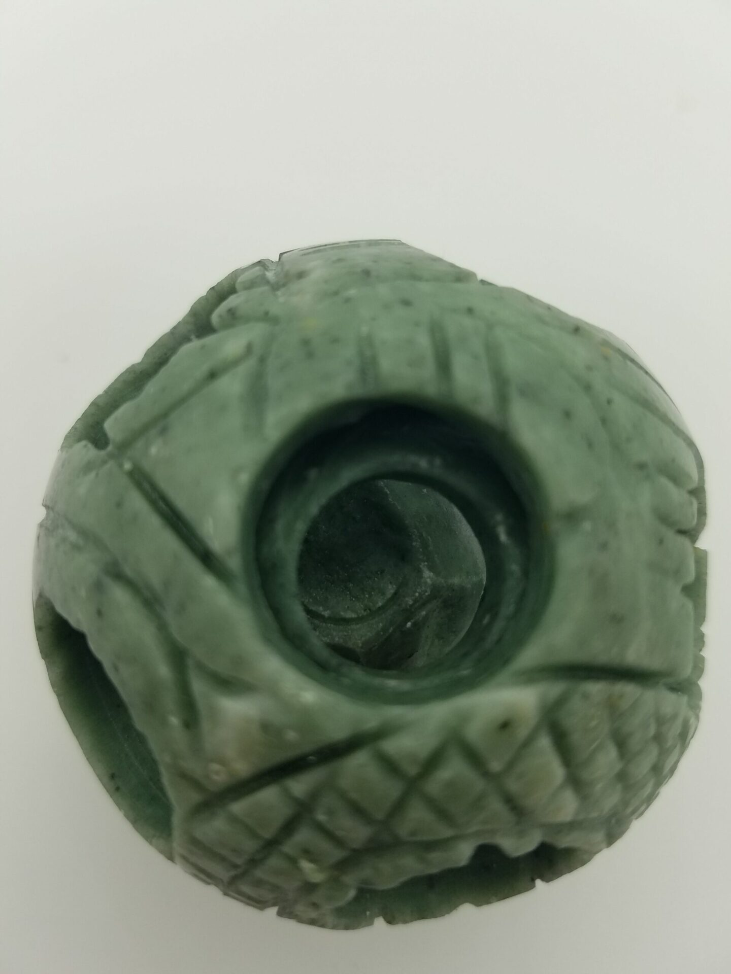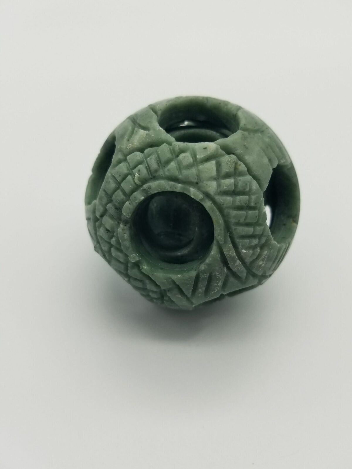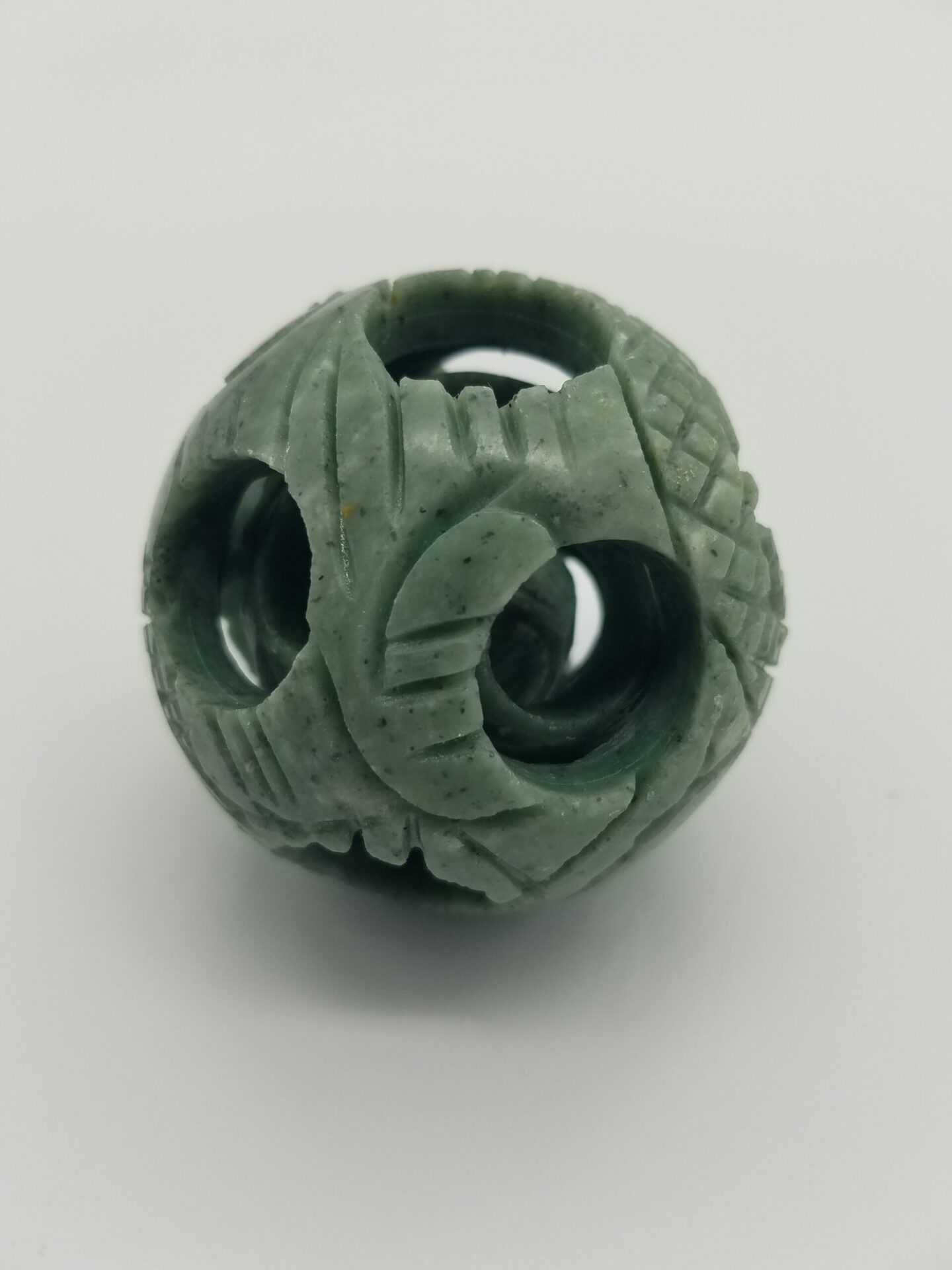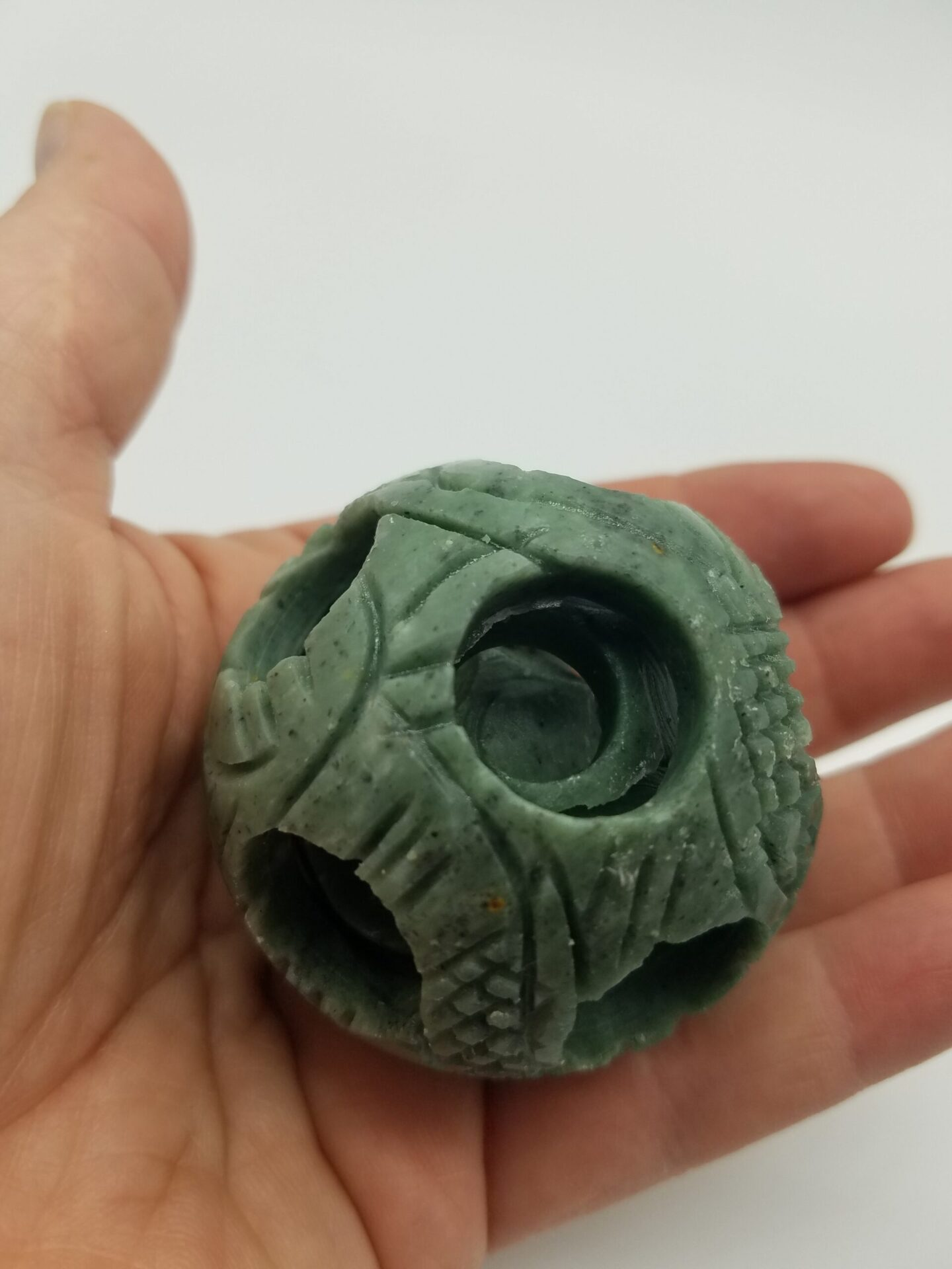 This stunning Feng Shui ball is meticulously carved from genuine Chinese green jade, with three concentric hollow spheres nested within one another. Each layer spins freely, symbolizing fluid movement and interconnected harmony.