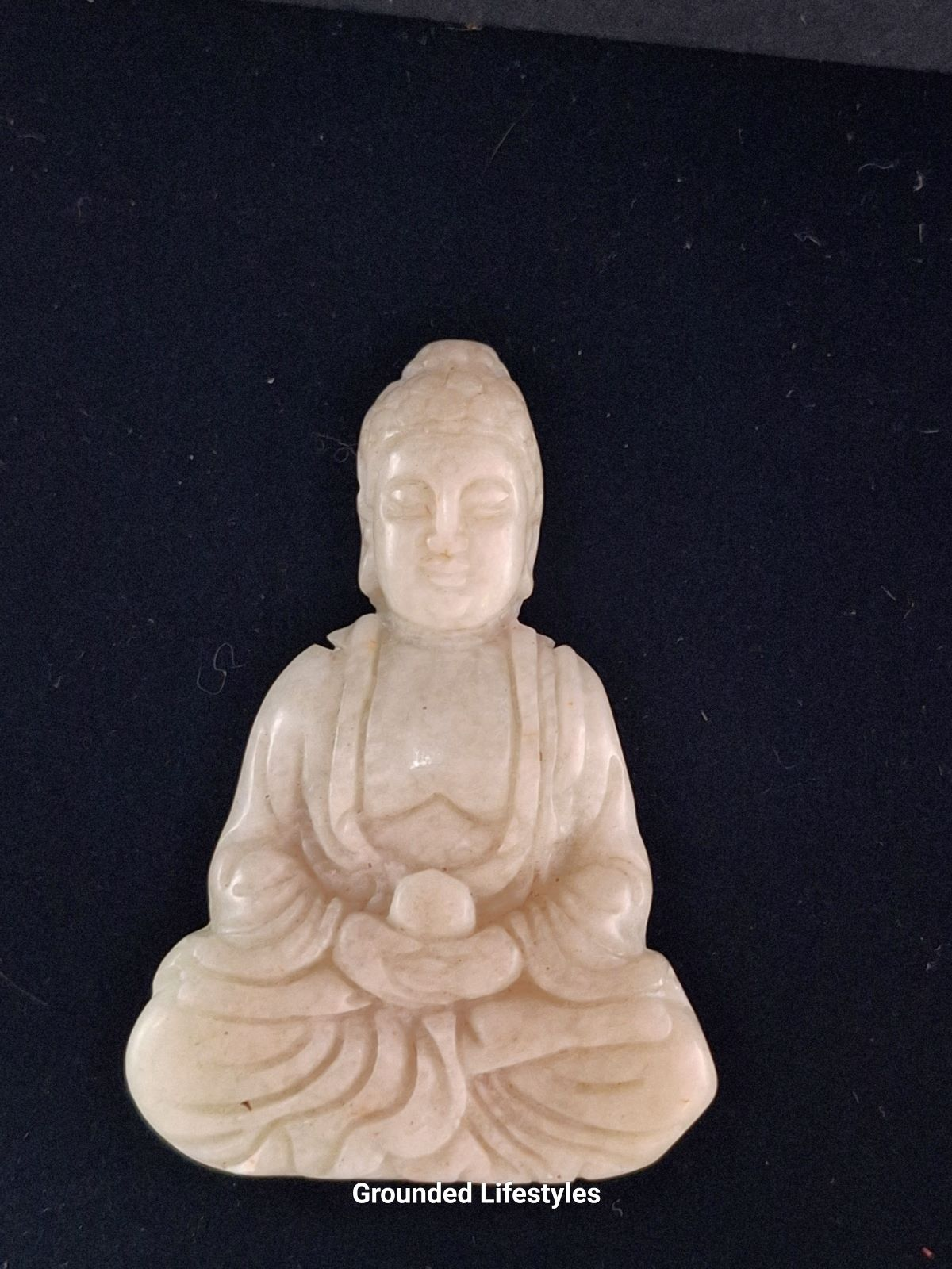 This 2.50-inch Buddha carving is shaped from natural white jade, valued for its smooth texture and soft, milky translucence. Artisans carve the figure with balanced proportions, rounded robes, and a calm facial expression that suits the stone’s gentle luster.
