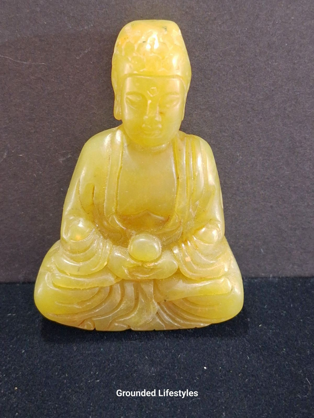 Each 2.25-inch carving varies slightly in tone, ranging from soft butter-yellow to deeper amber. The finish is smooth and reflective, with natural mineral clouds or faint veining adding individuality. The carving’s gentle smile and rounded proportions embody contentment and benevolence — ideal qualities for display in both home and studio environments.