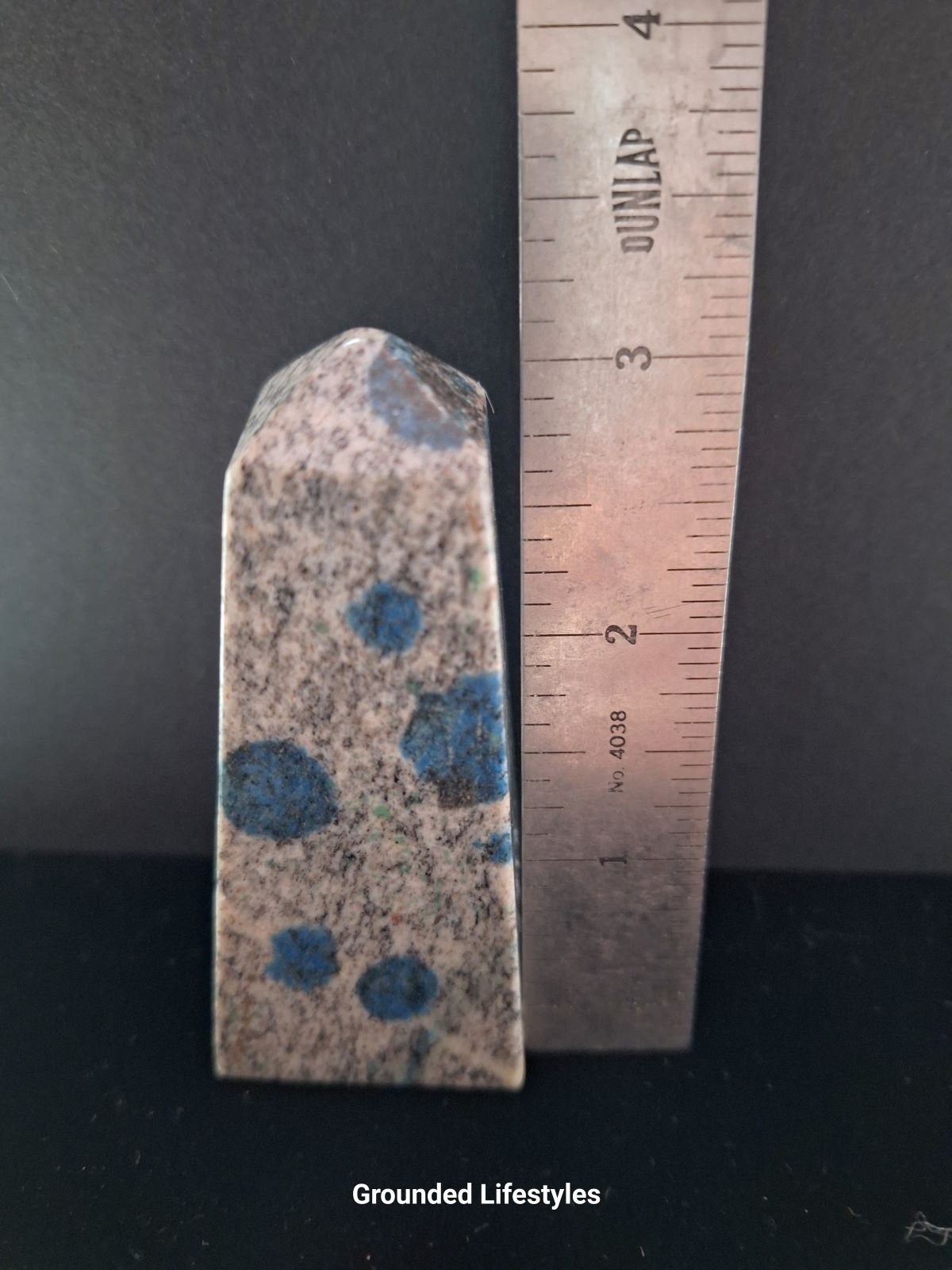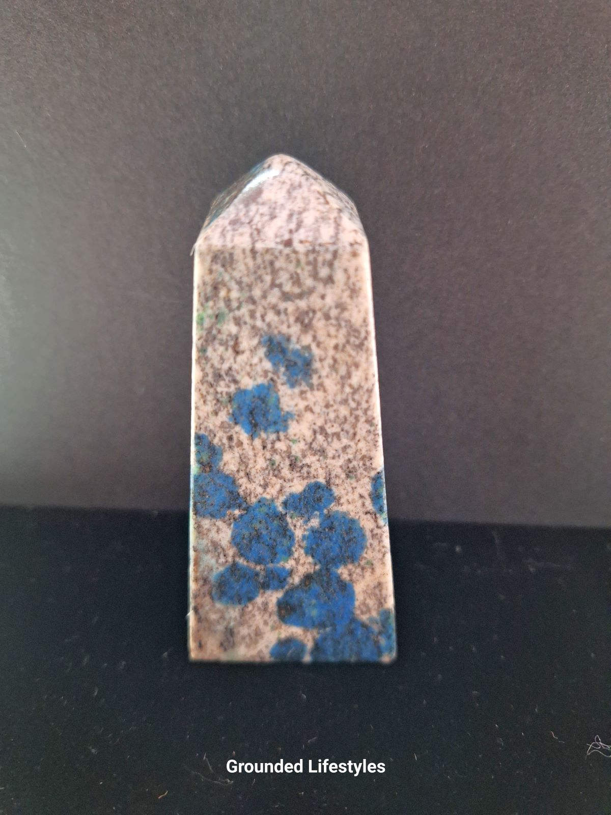 This 3.25-inch K2 obelisk is carved from natural K2 stone, a striking granite known for its scattered blue azurite orbs. The obelisk form features smooth, polished faces and a precisely tapered summit, emphasizing the stone’s contrast between pale granite matrix and vivid mineral inclusions.