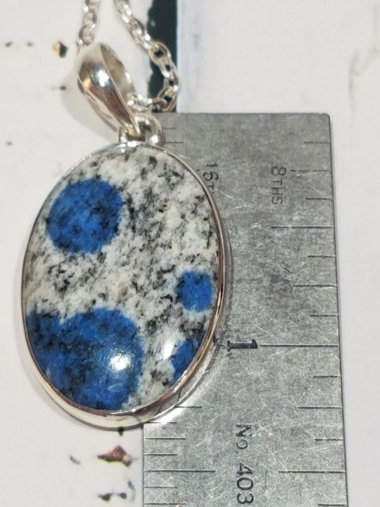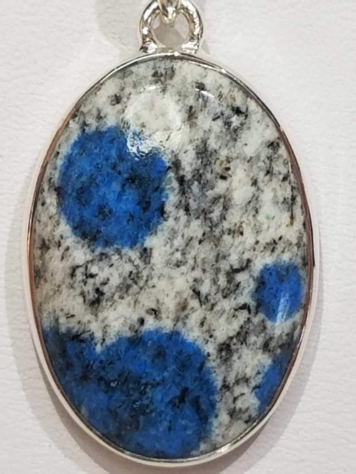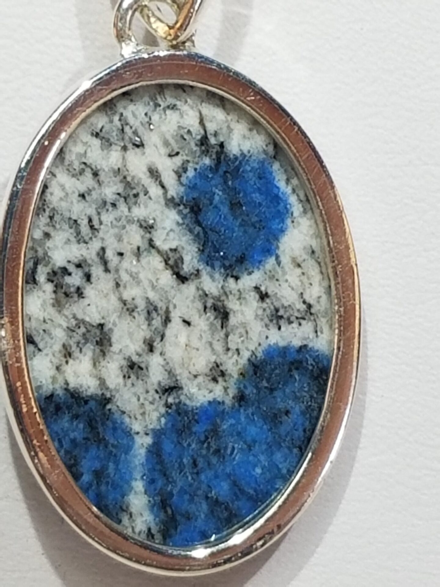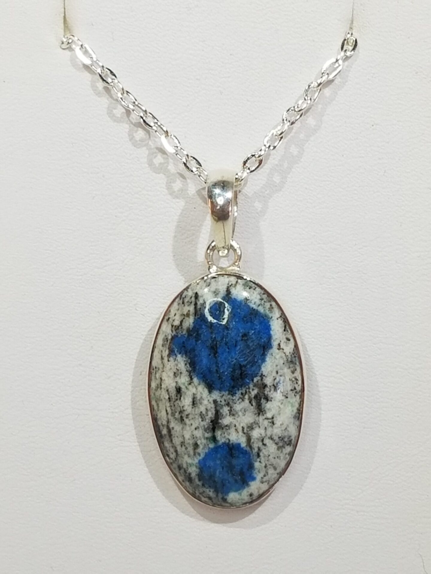 Every pendant is visually distinct — azurite orbs appear as natural brushstrokes scattered through light granite. The oval cut complements the organic patterning, creating a balanced mix of geometry and natural randomness.