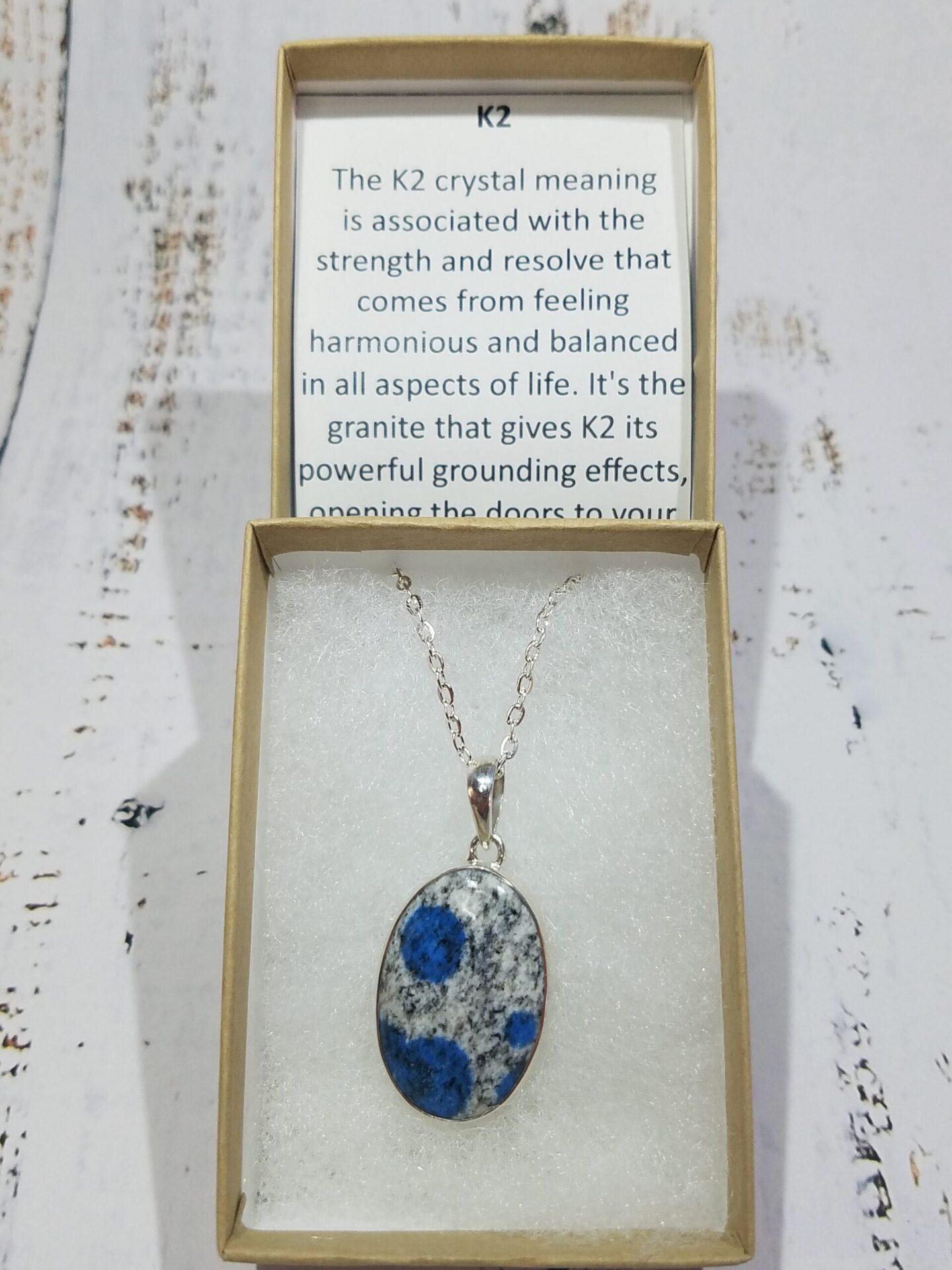 This K2 Oval Pendant measures 1.25 inches long by 0.75 inches wide and is hand-set in Sterling Silver 925. The stone exhibits a crisp contrast of sky-blue azurite orbs suspended in pale granite, a natural color pairing found only at the slopes of Mount K2 in northern Pakistan. Each pendant includes a silver-plated 18-inch chain and ships in a presentation box ready for gifting or display.