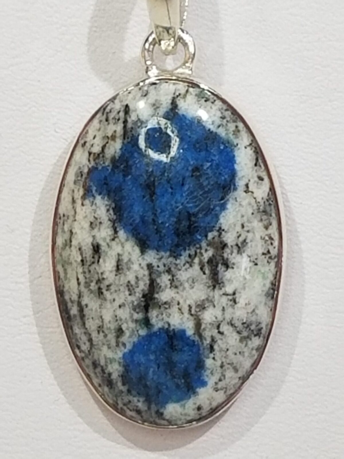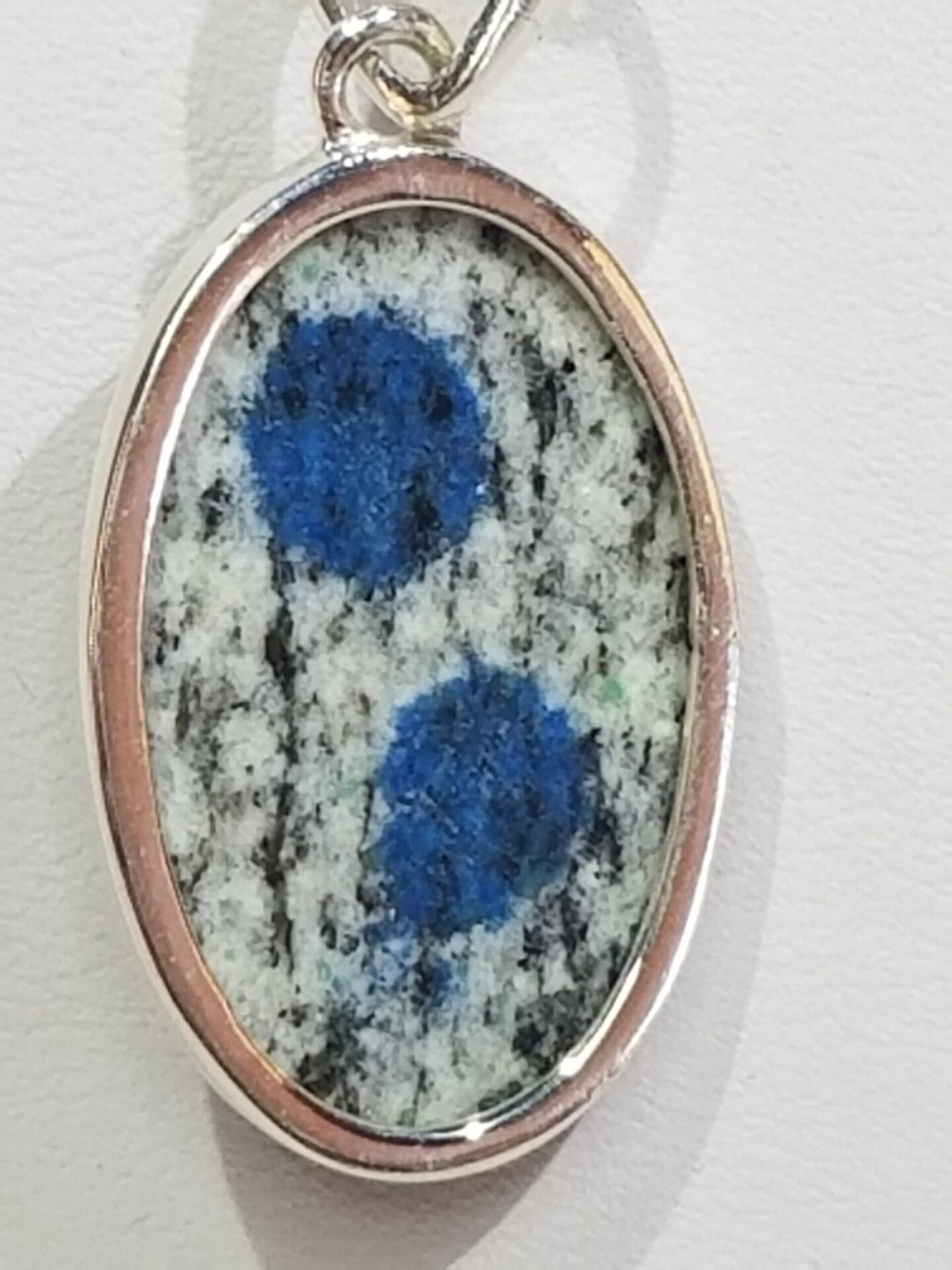 Each pendant is visually distinct. The blue azurite orbs appear as painterly dots scattered across the pale granite surface, evoking snowy mountain imagery. The oval cabochon cut enhances the flow of these natural markings while the silver setting adds refinement suitable for everyday wear or fine display.