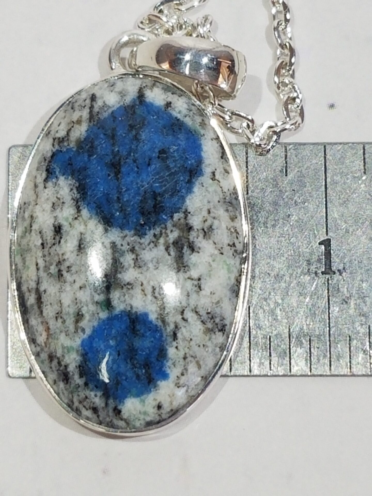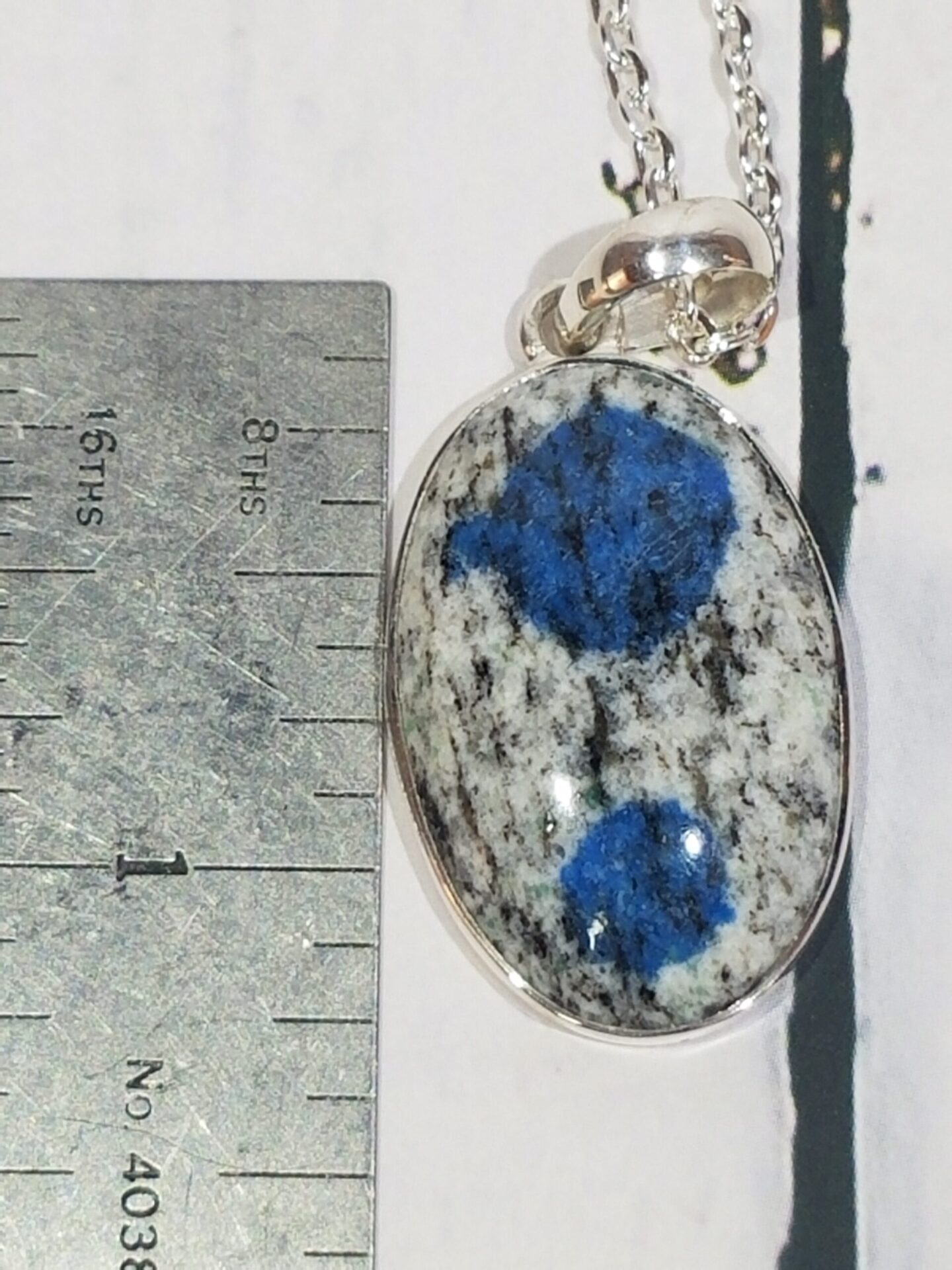 This K2 Oval Sterling Silver Pendant measures 1.25 inches long by 0.75 inches wide and is set in fine Sterling Silver 925. Each stone displays a natural granite base dotted with bright azurite inclusions, a combination found only in northern Pakistan near Mount K2. The stone’s pattern evokes snowy peaks against a mountain sky, making each pendant one-of-a-kind. Includes a silver-plated 18-inch chain and a presentation gift box for storage or gifting.