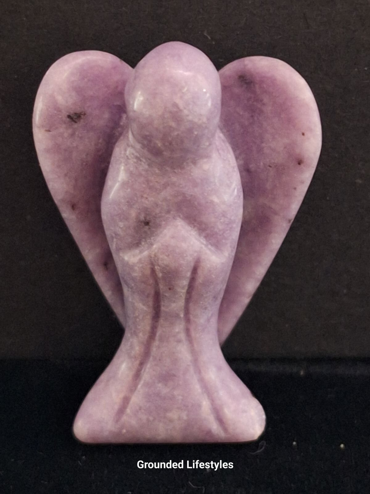 The angel signifies peace, renewal, and quiet strength, while lepidolite represents adaptability and graceful change — the layered structure mirroring transformation over time: