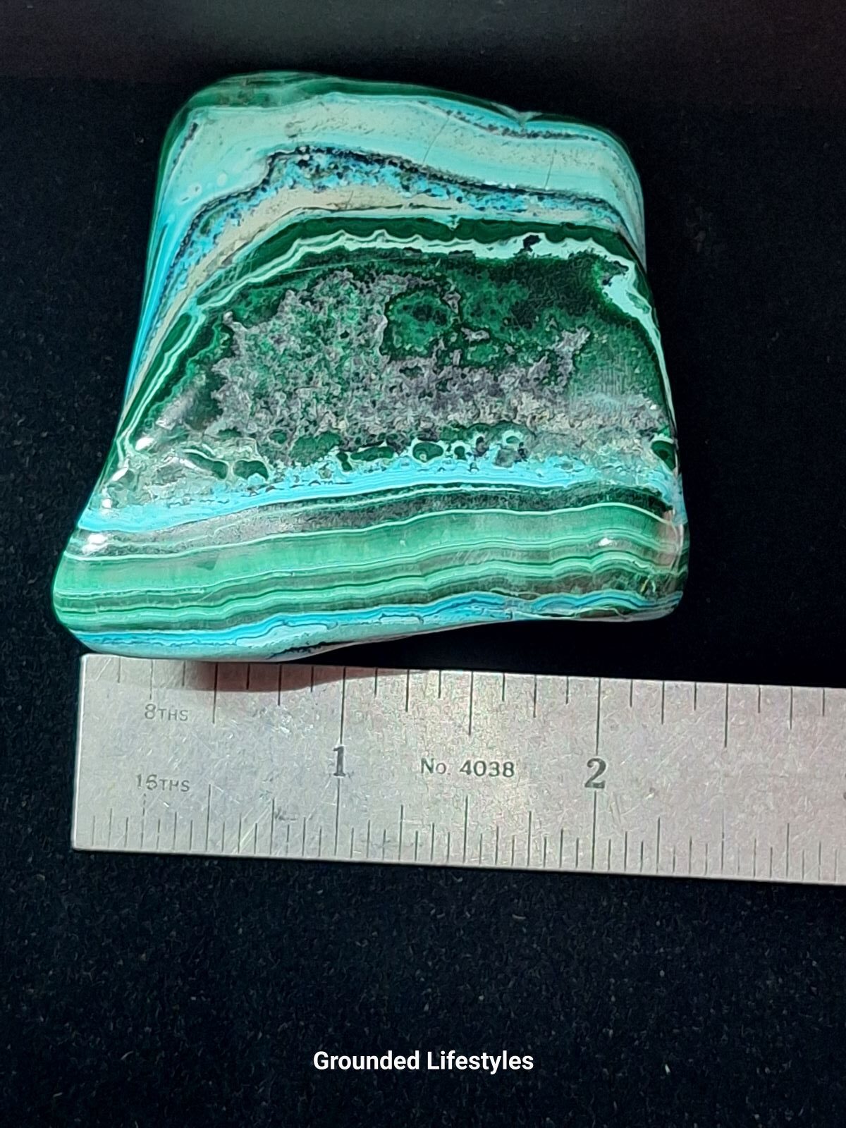 This freeform features vivid green bands of Malachite transitioning into turquoise Chrysocolla zones, polished to a glossy finish that highlights its layered mineral patterns. Compact at 2.25 inches, it’s ideal for collectors or small display settings where color contrast and polish quality are emphasized.