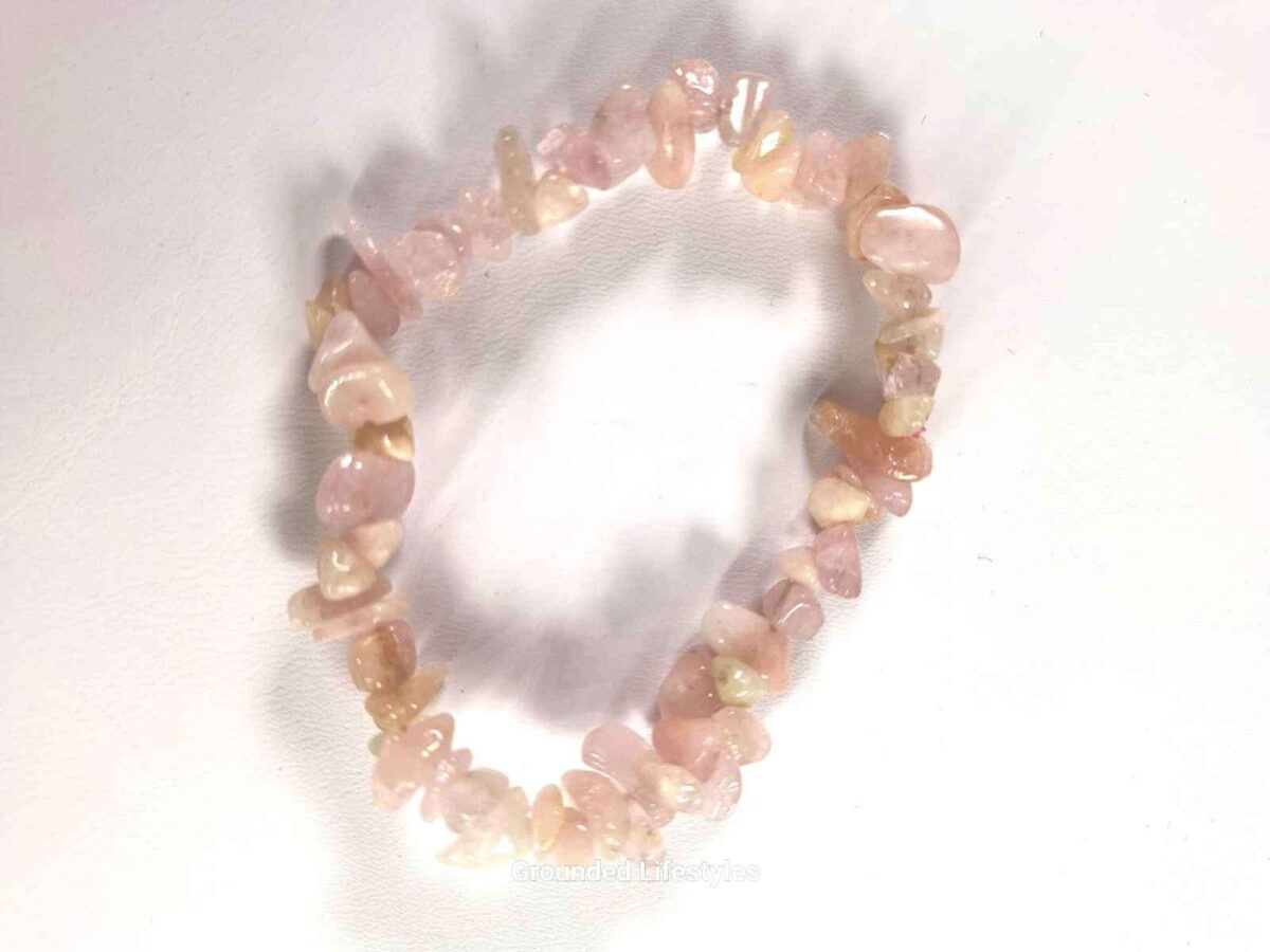 This Morganite chip stretch bracelet radiates tender elegance through its soft shades of pink, peach, and salmon. Often linked to romance and compassion, morganite is cherished as a gemstone that opens the heart and nurtures emotional healing. Its natural pastel tones make it a versatile, soothing accessory.