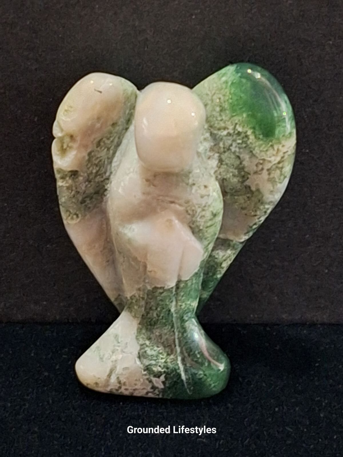The angel is a universal symbol of guidance, peace, and protection. When carved from moss agate, that symbolism deepens through the stone’s living, organic imagery: