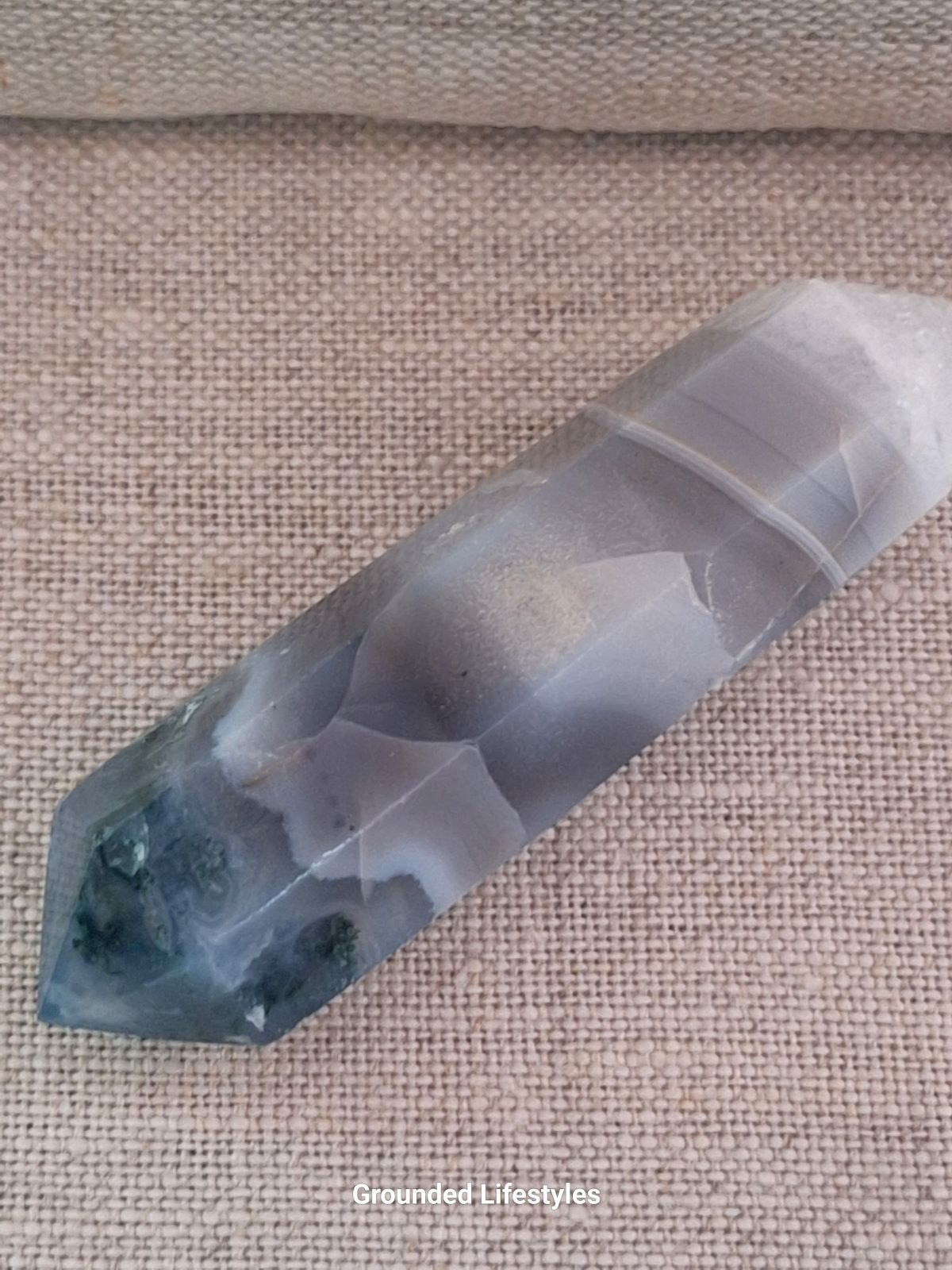 Because natural double terminated points rarely form in moss agate, lapidaries carve these shapes by hand, creating balanced, symmetrical crystal forms with strong visual appeal.