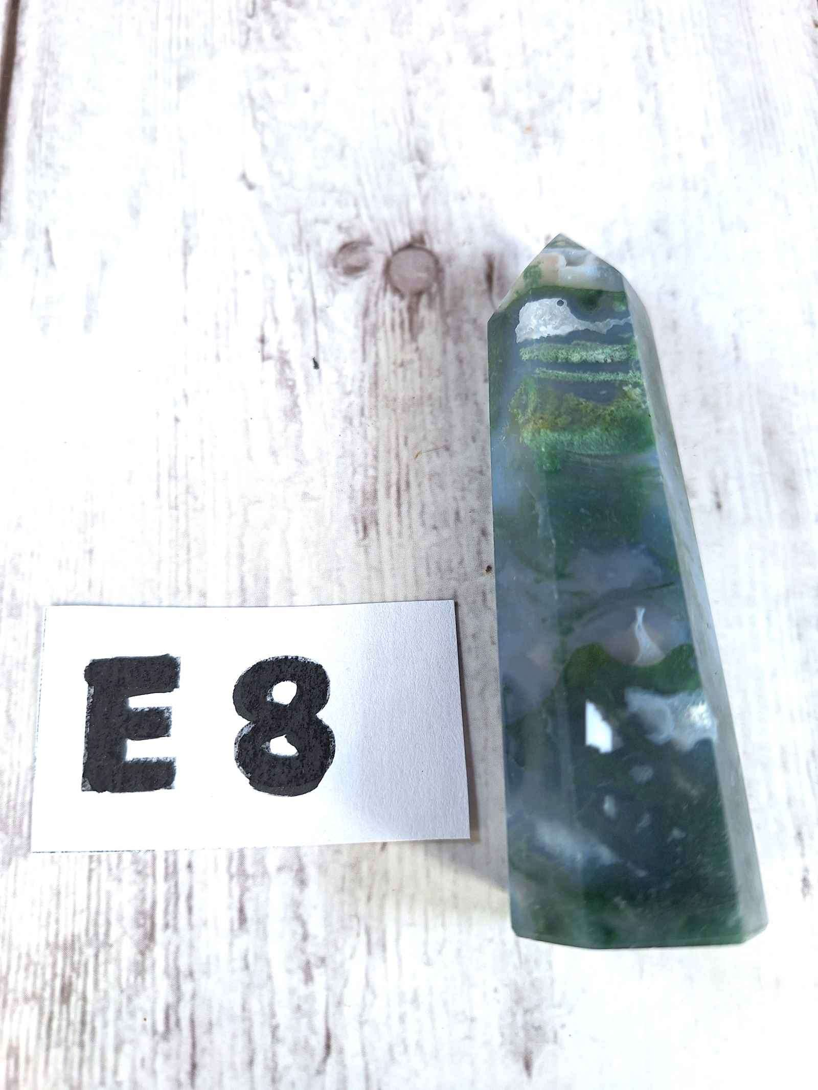 This polished Moss Agate Point showcases translucent chalcedony with intricate green dendritic patterns reminiscent of moss or foliage. The tapered tip emphasizes the stone’s natural banding and makes it a striking display piece or focal accent for meditation and mindful spaces.