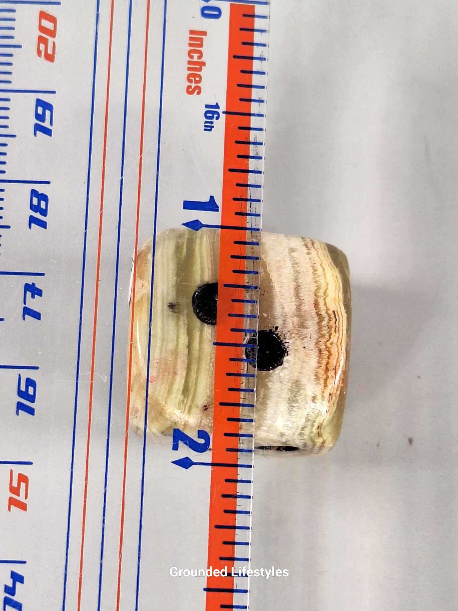 These dice are carved from green banded onyx, a type of calcite (calcium carbonate) formed in hydrothermal environments. Over time, mineral-rich water deposits calcium carbonate in layers, creating the characteristic bands of green and other earthy tones. Trace amounts of iron give the green hues, while the layered formation results in a semi-translucent, durable stone. With a Mohs hardness of 6.5–7, this material is ideal for carving and polishing into smooth, elegant dice.