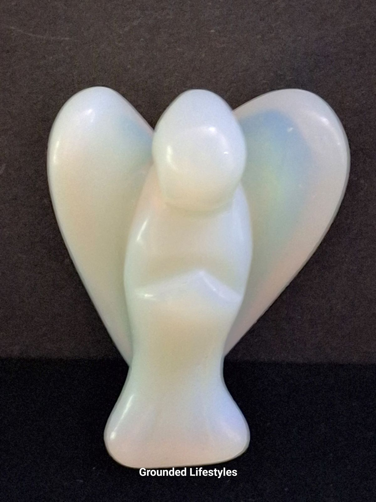 Collectors often display opalite angels as decorative symbols of hope, comfort, or gratitude, appreciated for their light-capturing beauty.