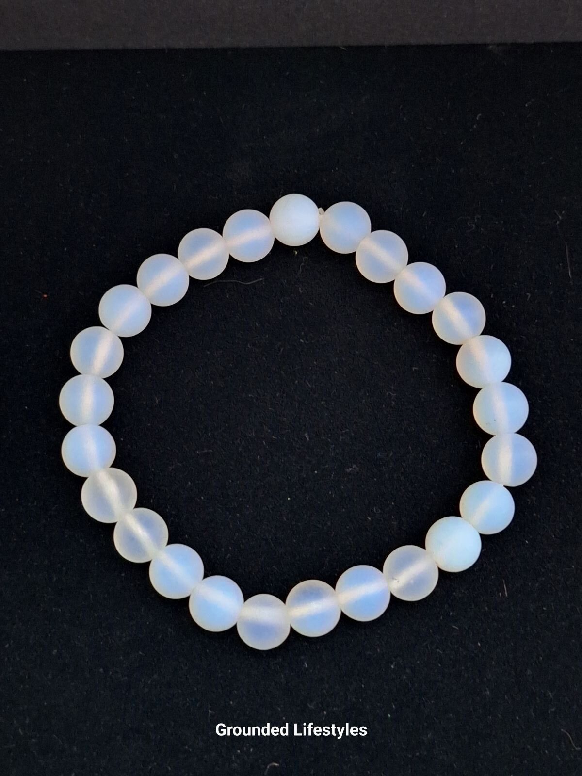 This 6mm Opalite elastic bracelet features smooth, polished beads made from man-made opalite glass, engineered to replicate the gentle luminescence of natural opal. Though not a naturally occurring mineral, opalite’s composition — a silica-based glass with trace metal oxides — gives it an alluring play of light known as opalescence, where milky blues and warm yellows shift under different lighting.