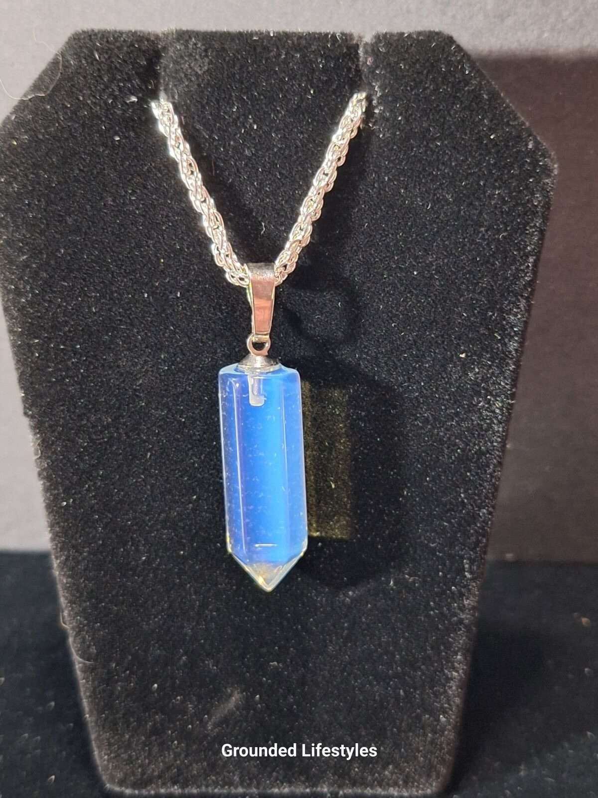 Each Opalite bullet pendant exhibits a glowing blue-white transparency that intensifies in natural light. The polished termination and even color zoning make it an elegant display of craftsmanship and optical depth. The included 18-inch silver chain complements its minimalist style and subtle luminescence.