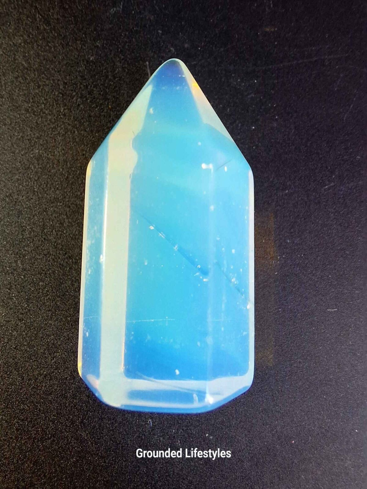 Opalite is an amorphous man-made glass with a Mohs hardness of 5.5–6, offering a durable yet visually striking specimen. Its smooth surface and subtle color variations make it a versatile display piece.