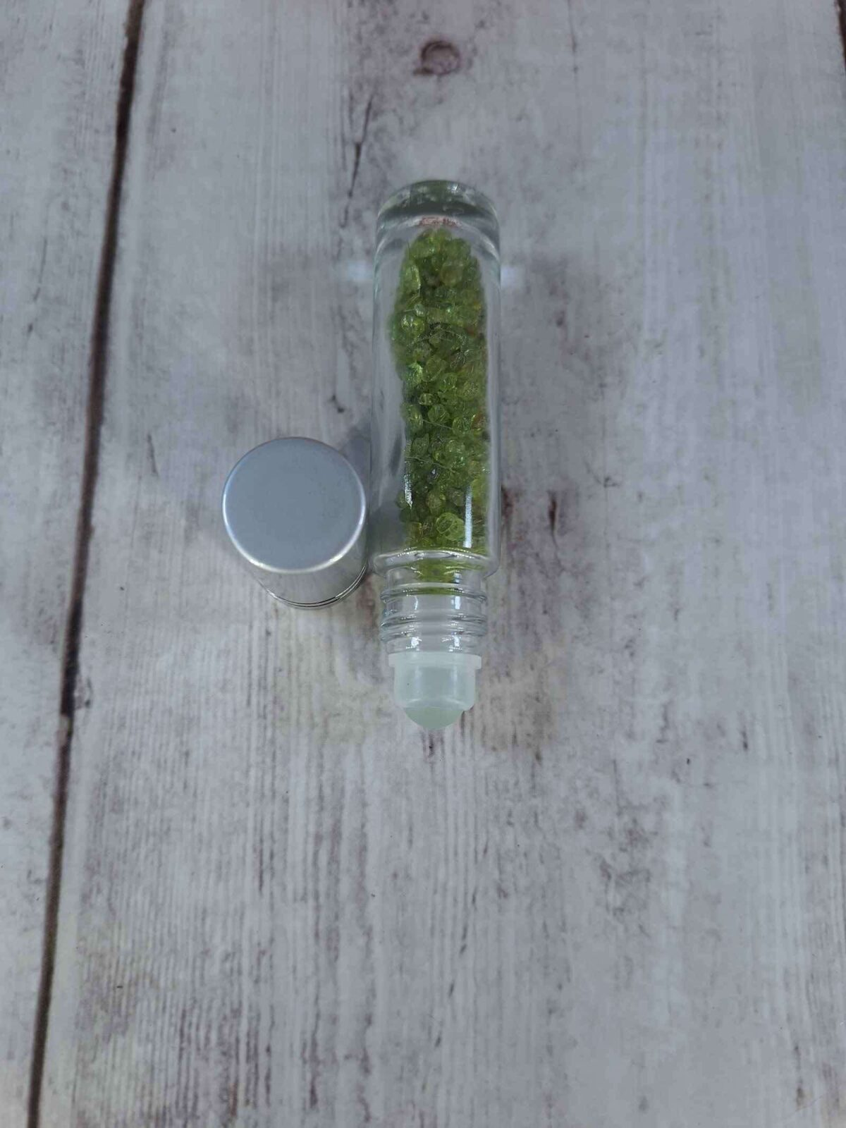 This essential oil roller is infused with genuine peridot gemstones, known for their vibrant green hue and energetic qualities. The smooth glass roller allows easy, precise application of essential oils. Users can also add other essential oils, perfumes, or custom blends to personalize their experience.
