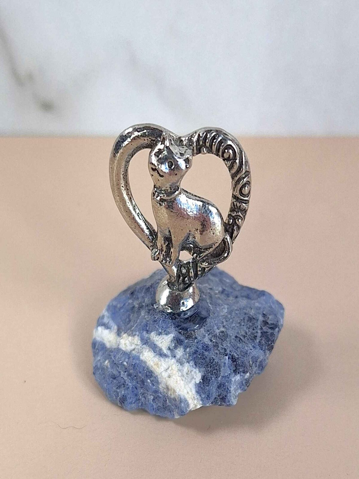 This Pewter Cat Heart on Raw Sodalite is a celebration of simplicity and tactile beauty. The pewter heart, with its beloved feline form, is expertly crafted and placed atop a rough-cut sodalite base. The contrast between the smooth metal and the raw, fractured stone invites both visual and tactile intrigue in this compact, emotive sculpture.