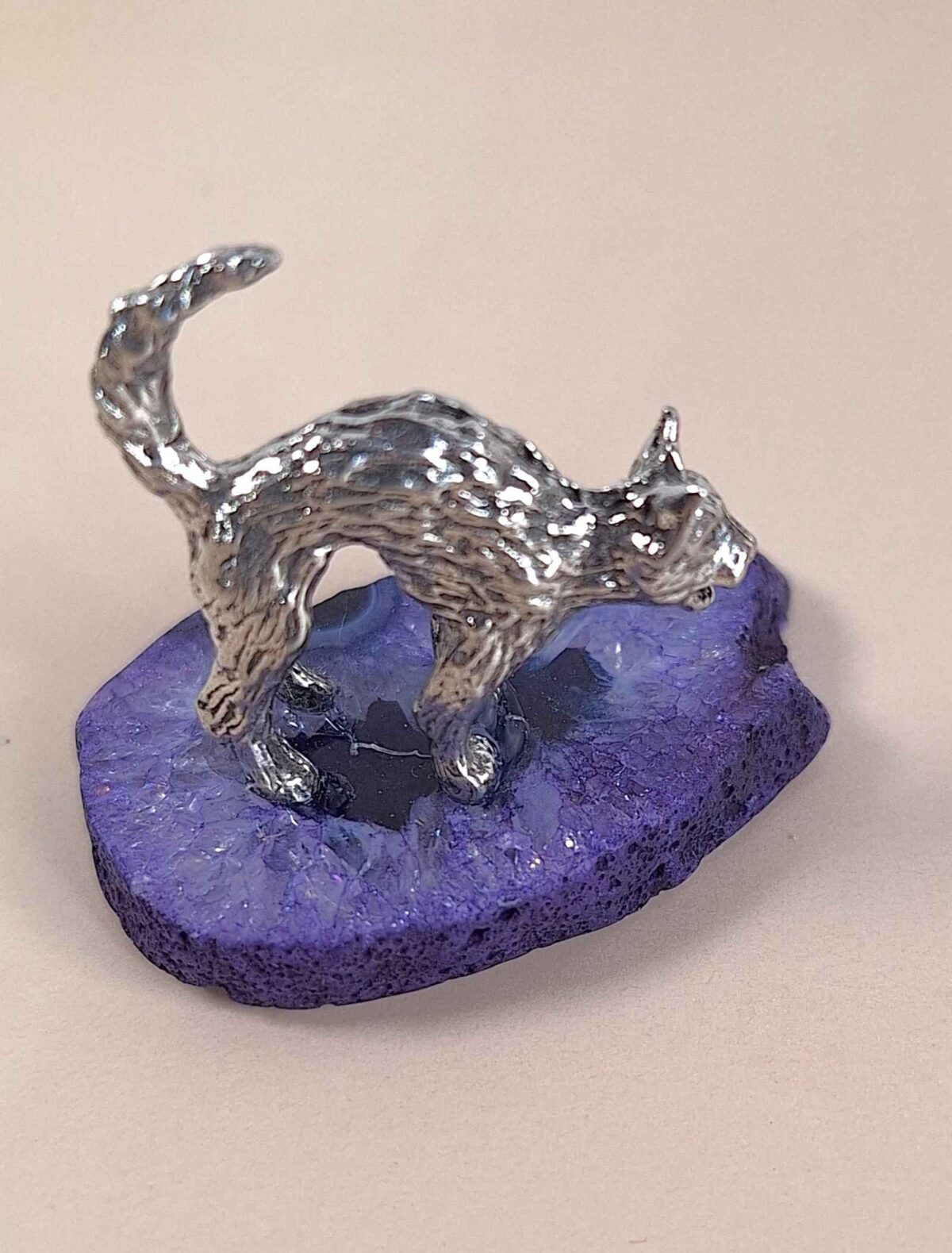 Delight in the whimsical elegance of the Pewter Cat on Purple Agate Slice. The pewter cat, cast with thoughtful detail—paws, posture, facial features—sits with poised calm upon a slice of rich purple agate. The stone is polished to reveal its natural bands and tones, while the pewter is finished to a gentle sheen. The combination of polished gemstone and gleaming metal showcases the hands of skilled artisans who value texture, contrast, and balance.