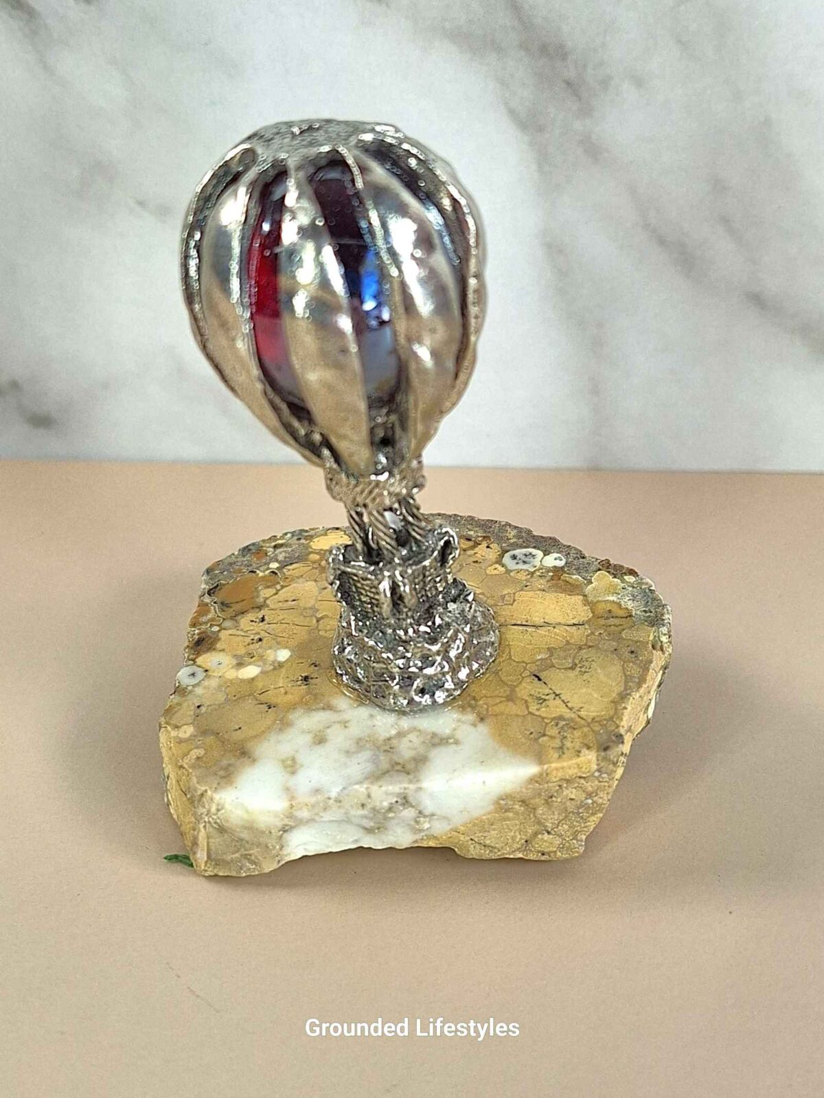 Soar into artistry and earth’s wonders with the Pewter Hot Air Balloon on Cobra Jasper—a handcrafted sculpture that marries geology, skilled pewter casting, and symbolic depth in one enchanting keepsake.