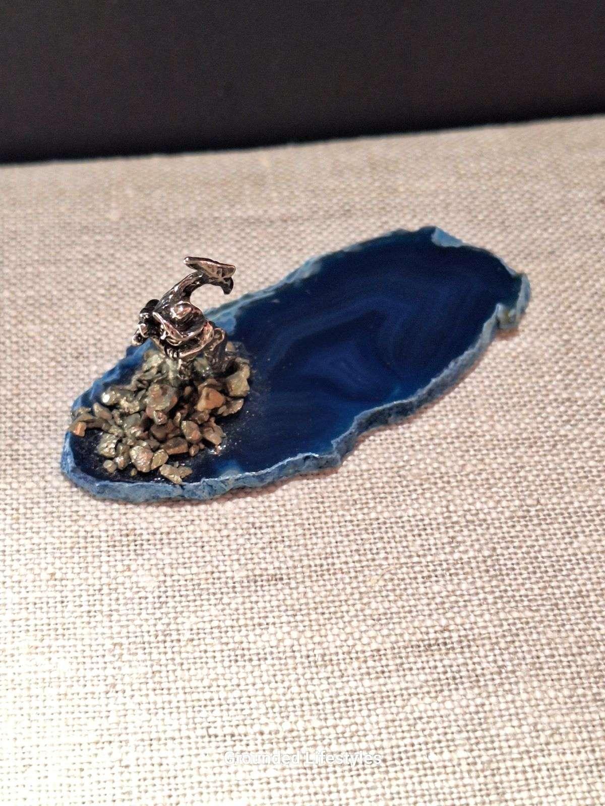 Dust lightly with a soft cloth. Avoid water or chemical cleaners to preserve the pewter’s patina and prevent oxidation of pyrite surfaces. Keep out of prolonged sunlight to maintain agate’s natural color saturation.
