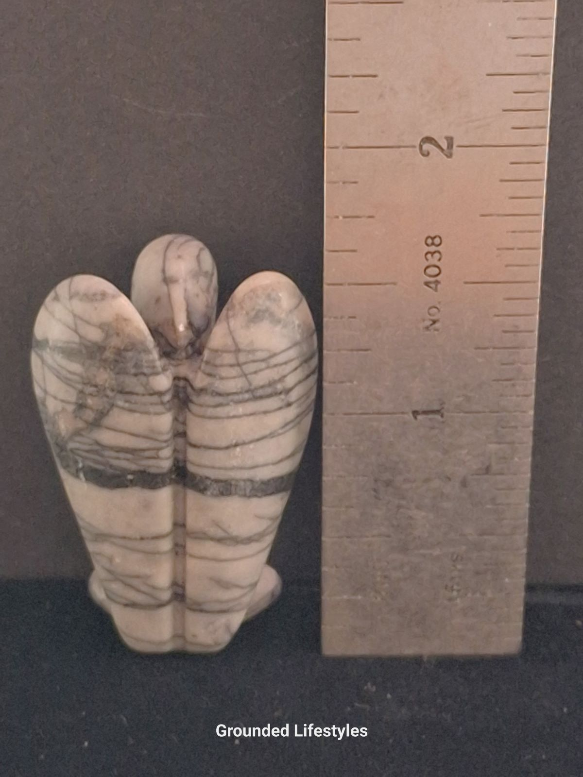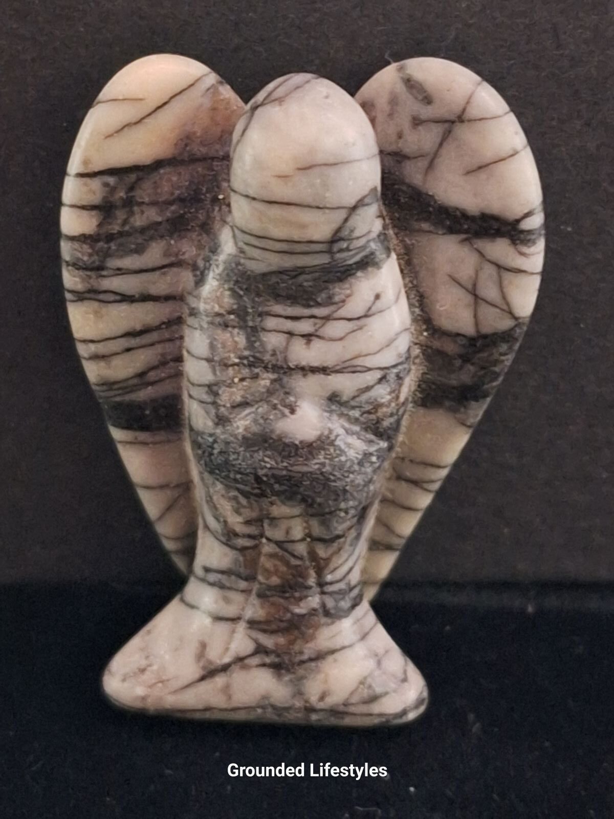 The angel represents clarity, inspiration, and guidance, while Picasso jasper reflects creativity, transformation, and harmony through structure. Together, they form a symbol of disciplined artistry and mindful awareness: