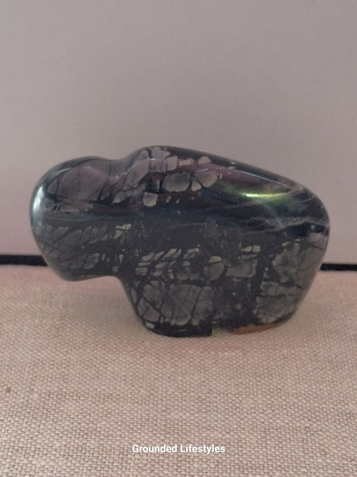 At 1.75 inches, this buffalo has enough size to showcase the stone’s dramatic patterning while remaining compact for shelves or display trays. Each carving differs based on natural stone veining, making every piece visually distinct.