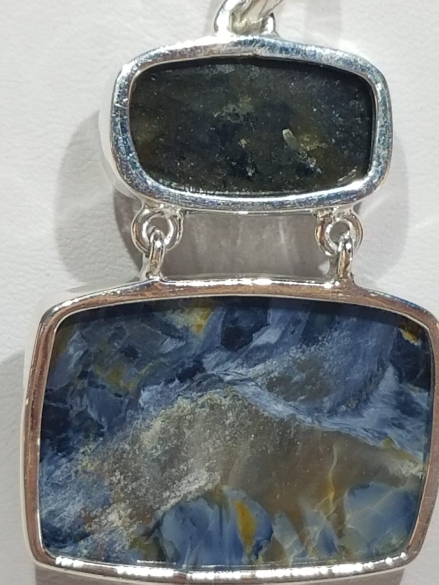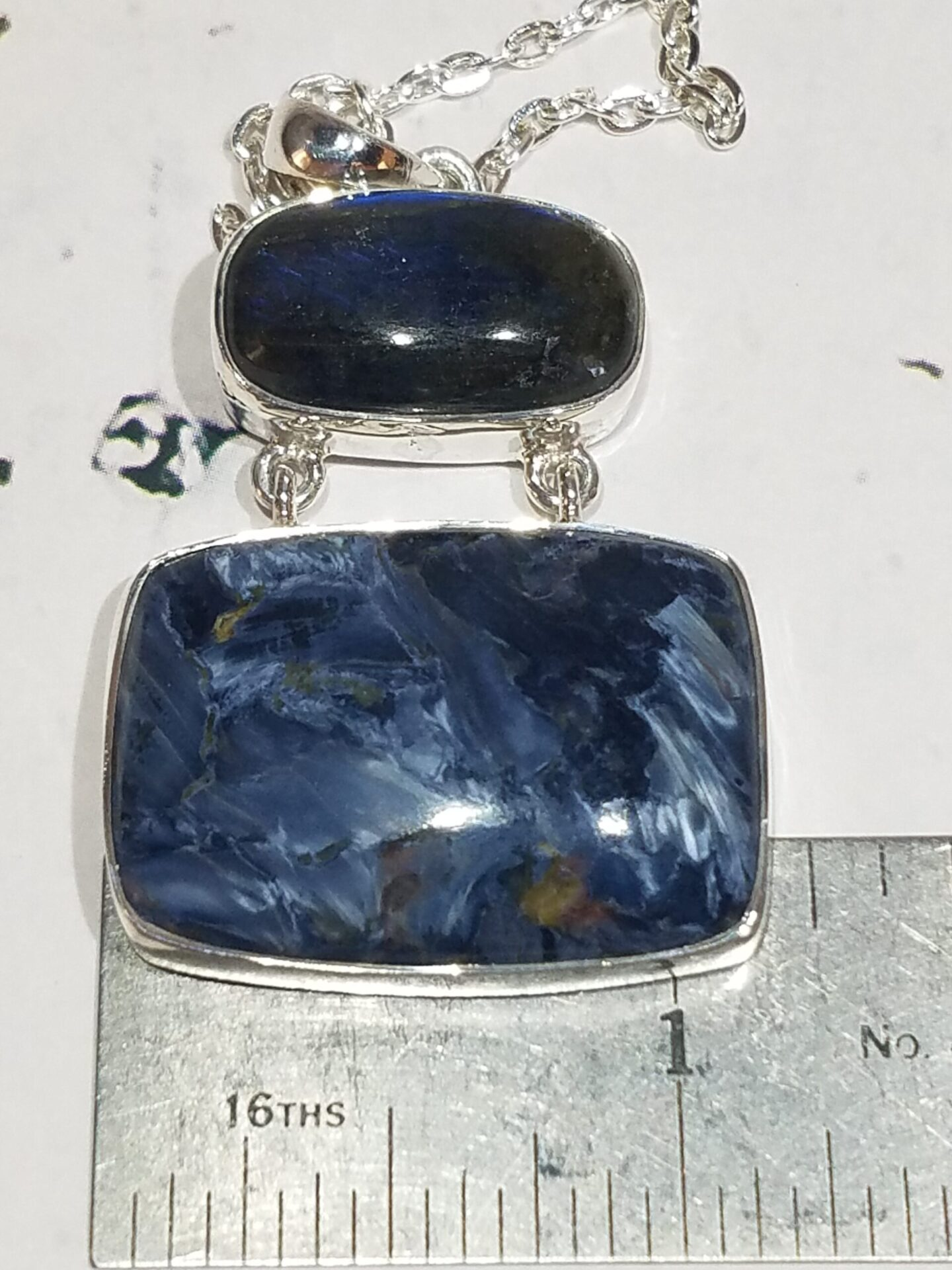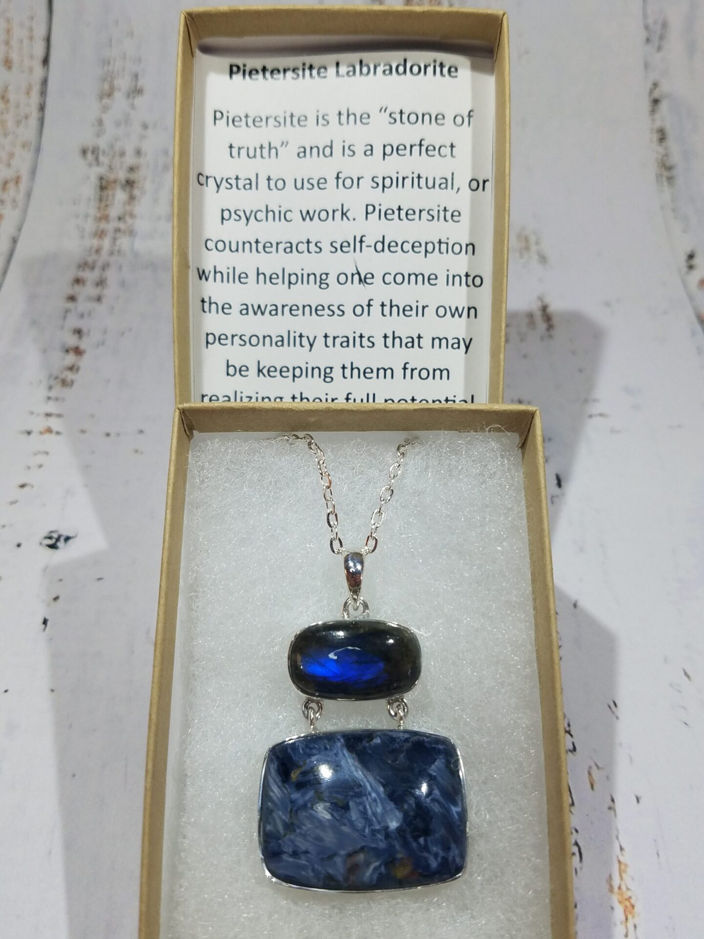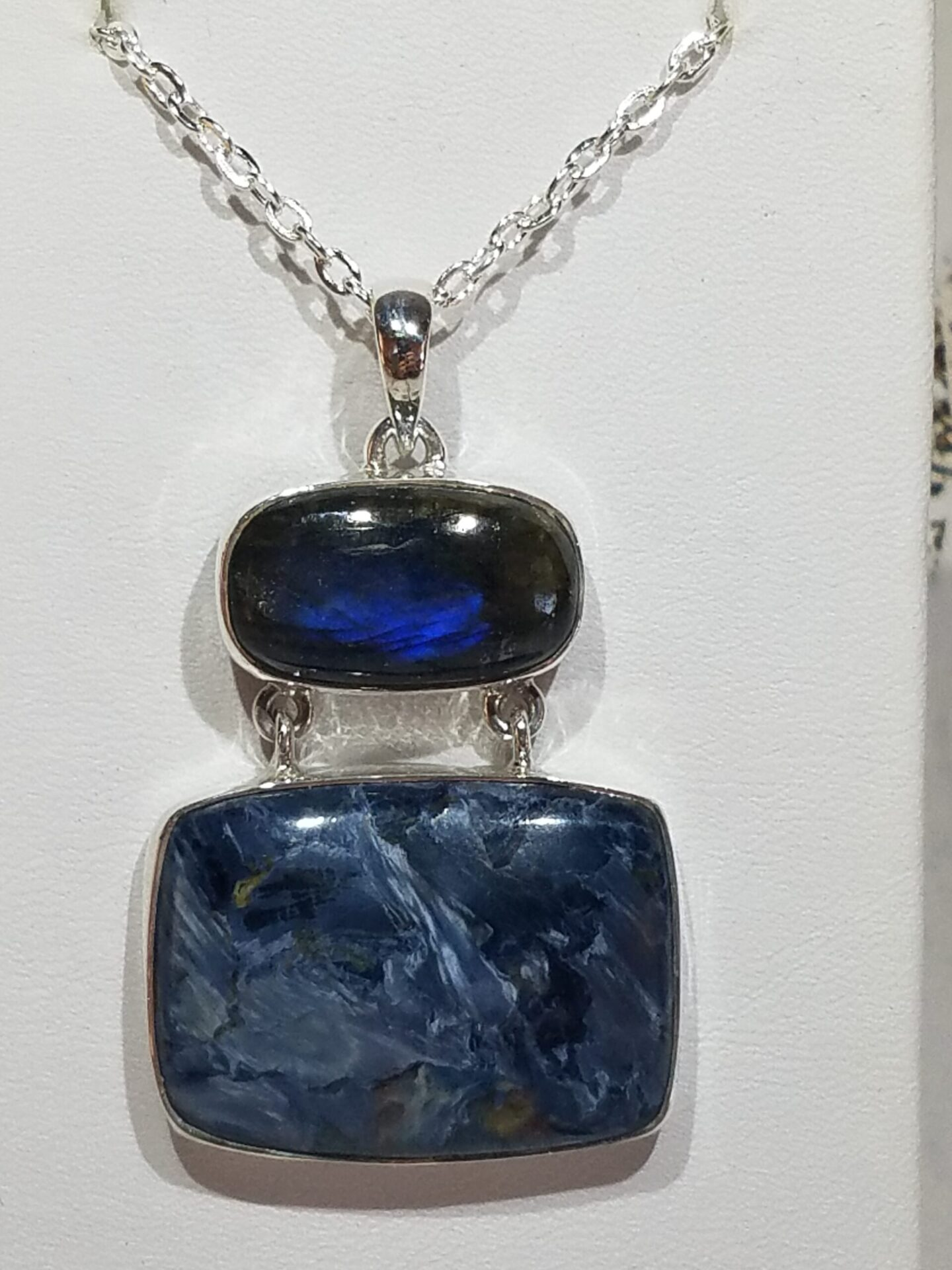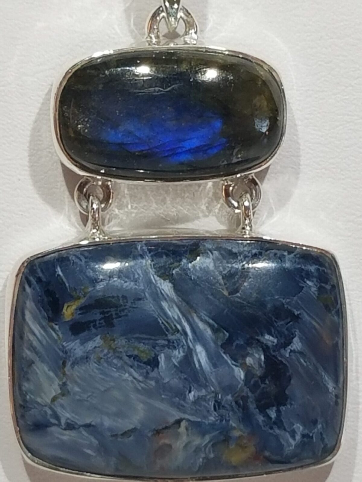 This pendant’s palette combines midnight blue, silver-gray, and flashes of aqua and gold. Pietersite’s swirling fibrous structure contrasts beautifully with Labradorite’s mirrored color play. Together they create a pendant alive with motion — shifting color as it catches the light.