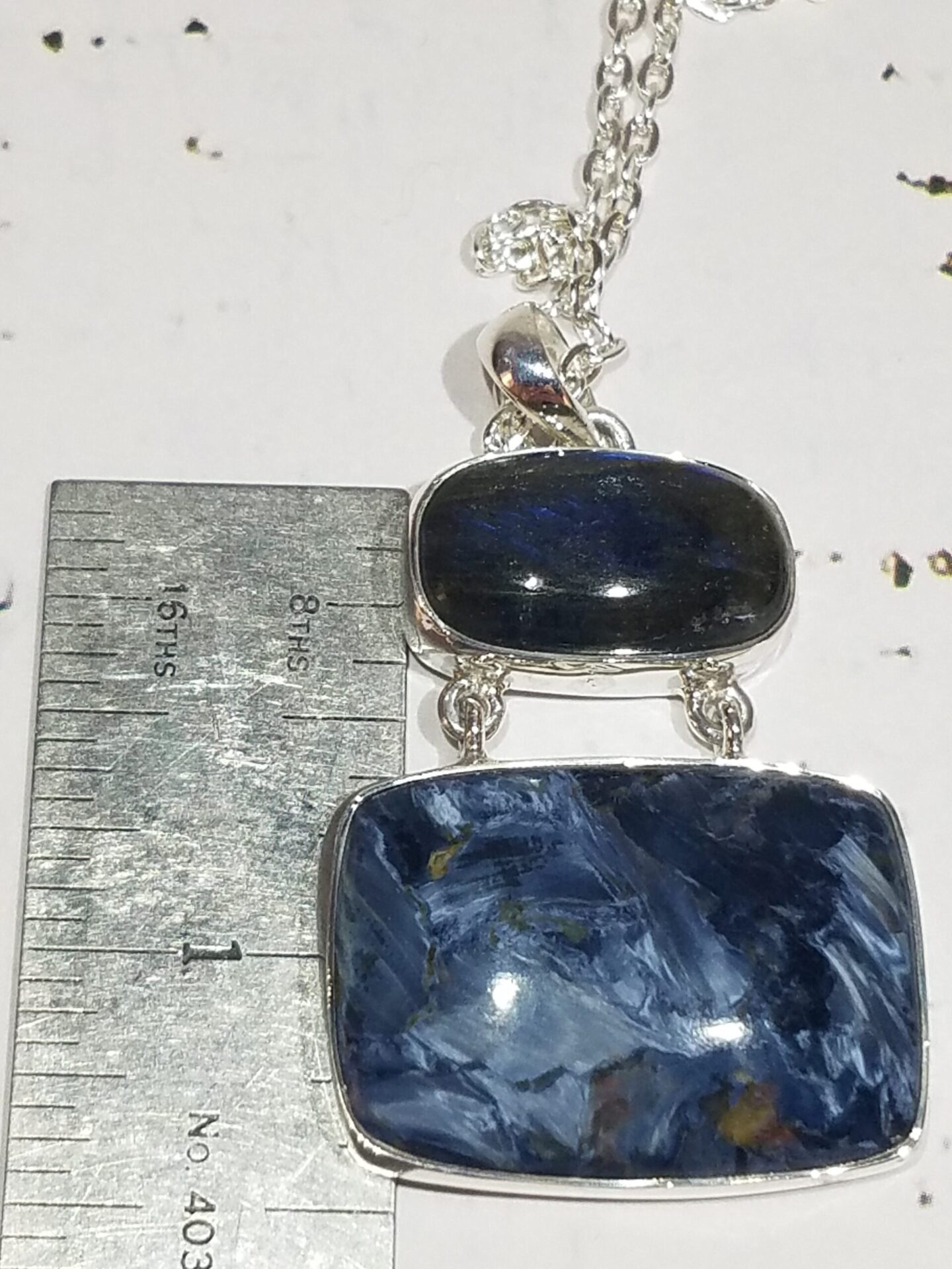 This Pietersite & Labradorite Sterling Silver Pendant pairs two exceptional optical minerals in one composition. Measuring 1.5 inches high by 1.25 inches wide, the piece unites the storm-like fibers of Pietersite with the iridescent flash of Labradorite. Each gemstone is hand-cut, polished to reveal natural depth, and securely mounted in Sterling Silver 925. Includes a silver-plated 18-inch chain and gift box.