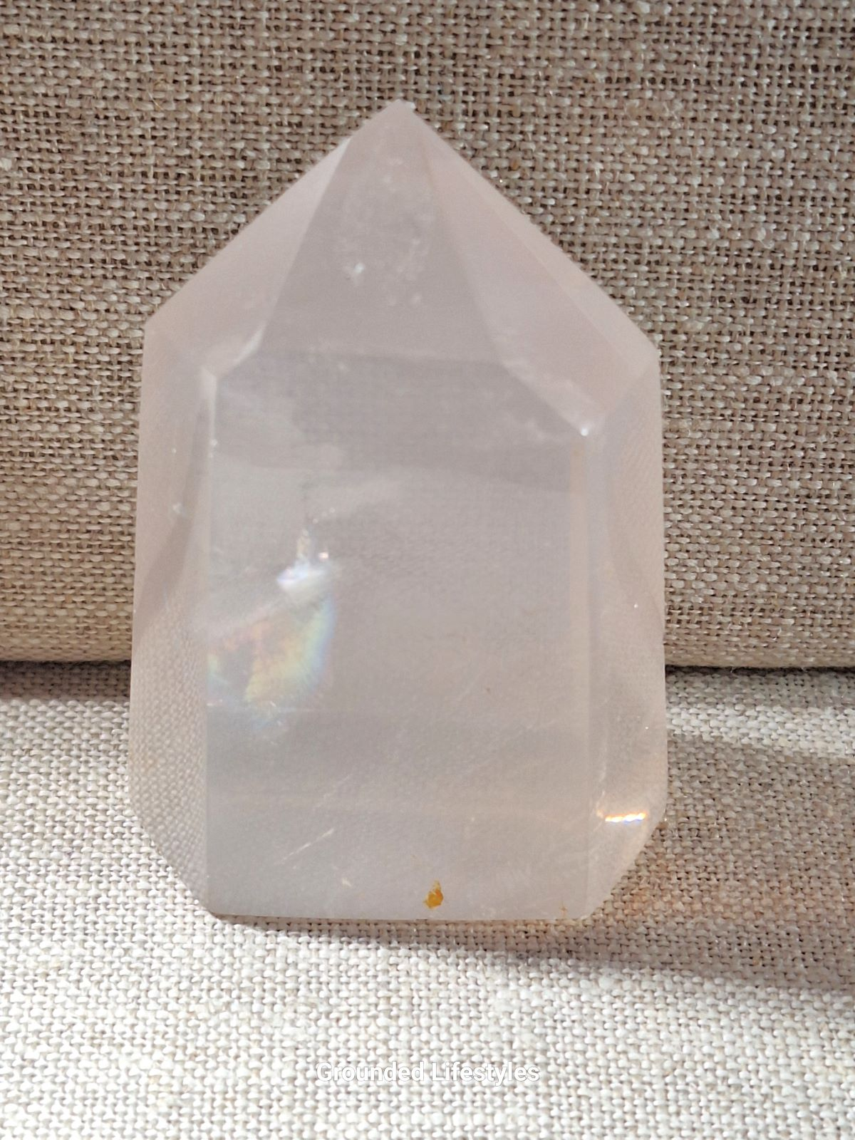 At 2.75 inches, this point is tall enough to display the internal glow that girasol quartz is known for. The soft pink tone is evenly distributed, and the polished facets provide clear views into the crystal’s interior. Its elegant translucence makes it ideal for natural-light display areas, small shelves, altars, or bedside décor.